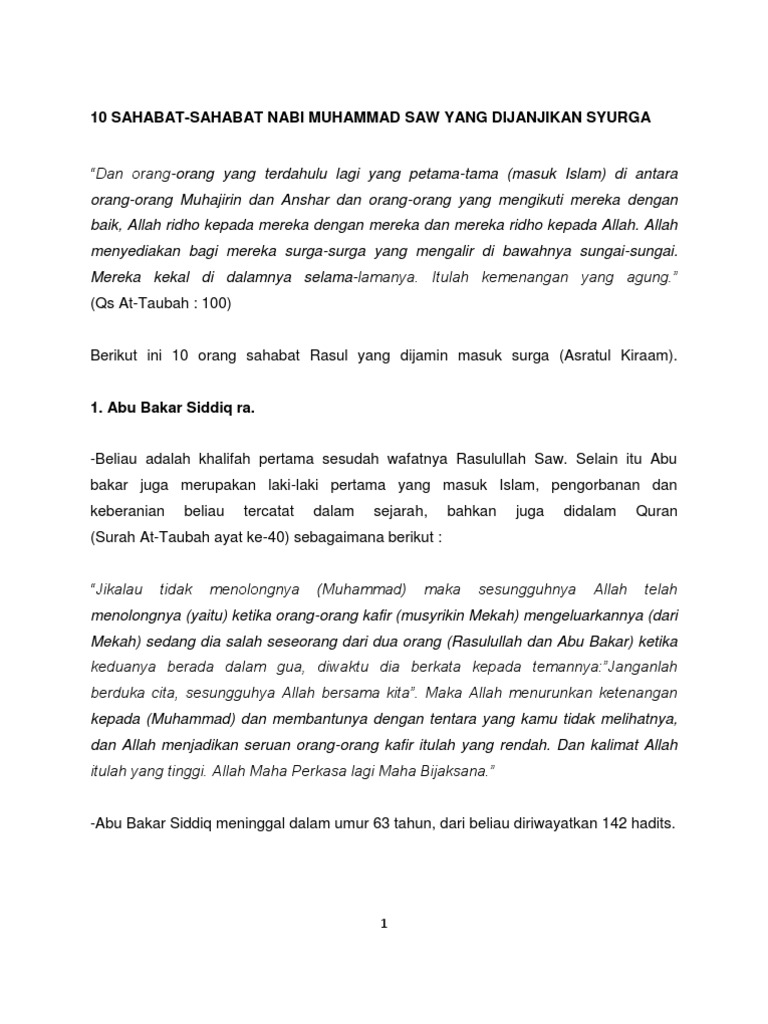 Berikut 10 sahabat nabi yang dijamin masuk surga yang dirangkum detikcom. Itulah 10 sahabat baginda yang dijanjikan allah dengan syurga. Abu bakar as siddiq r a.