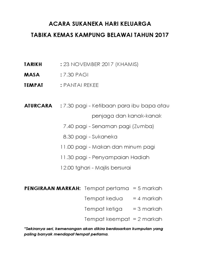 Cabutan bertuah akan dibuat selang seli dgn acara lain tukar tukar hadiah setiap keluarga perlu membawa hamper hadiah berjumlah rm 20 kemudian hadiah akan diletakkan nombor. Kertas kerja hari keluarga dan sukaneka anjuran persatuan penduduk dan madrasah al ittihadiyah taman maim bukit rumbia alor gajah melaka 1 0 pengenalan 1 1 hari keluarga merupakan satu hari yang dapat dilaksanakan di antara pemimpin masyarakat dan juga masyarakat setempat. Acara sukaneka hari keluarga toman.