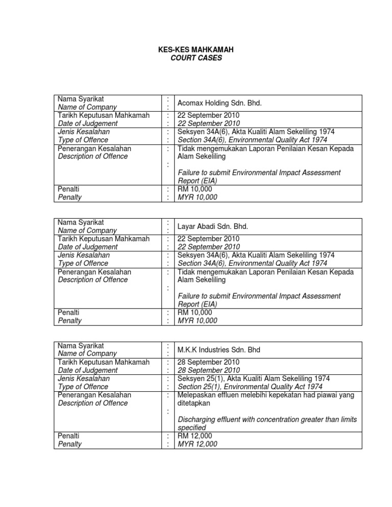 Kementerian alam sekitar dan air akan mengkaji akta kualiti alam sekeliling 1974 untuk hukuman lebih berat dengan menaikkan denda maksimum rm10 juta kepada pesalah pencemaran alam sekitar. 1 melainkan jika dilesen tiada seseorang boleh mengeluarkan melepaskan atau meletakan apa apa benda berbahaya kepada alam sekeliling pencemar atau buangan ke dalam mana mana perairan daratan dengan melanggar syarat syarat yang boleh diterima yang ditentukan di bawah seksyen 21. Akta kualiti alam sekeliling.