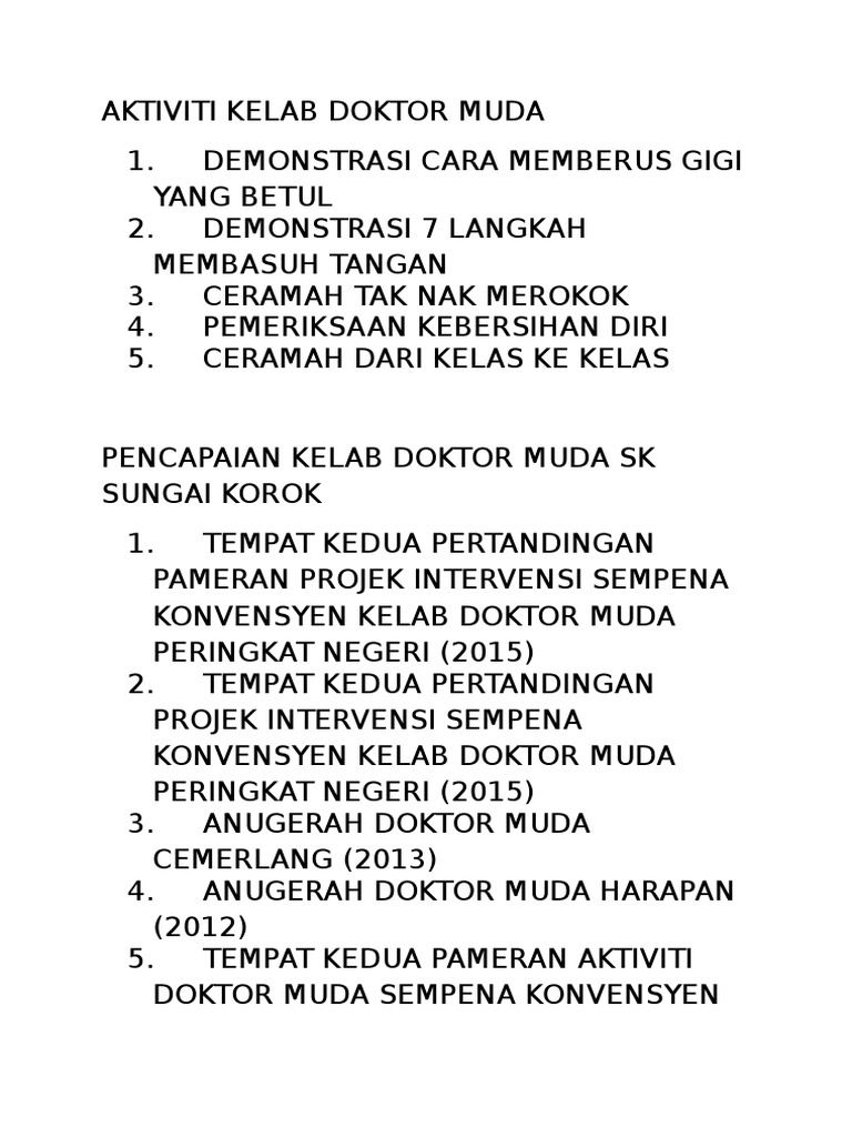 Modul latihan terkini yang dihasilkan adalah modul latihan kelab doktor muda sekolah rendah edisi keempat 2013. 24 2 2009 bilik muzik perjumpaan ahli kelab dan pendaftaran ahli baru sesi 2006. Memupuk sifat kepimpinan dan keyakinan di kalangan doktor muda.