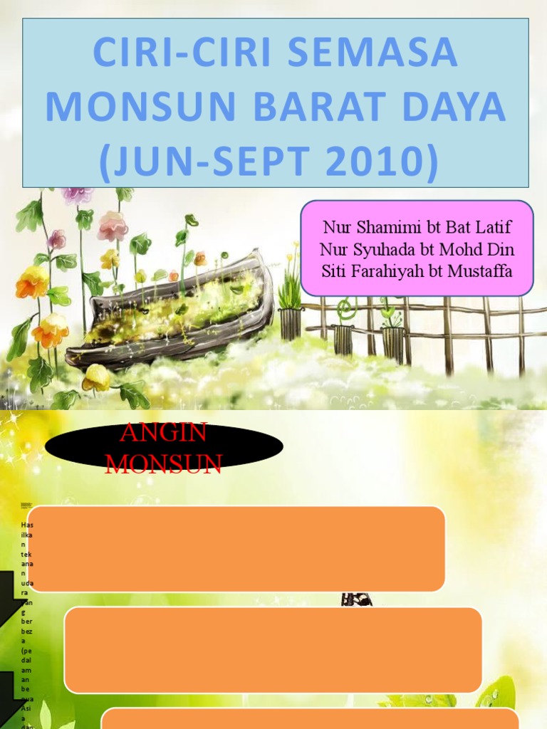 Pengertian angin monsun monsun merupakan sistem sirkulasi regional yang mempunyai variasi musiman dengan adanya gerak semu matahari terhadap bumi secara periodik di belahan bumi utara dan selatan menyebabkan angin di wilayah indonesia sangat dipengaruhi oleh adanya perbedaan sel tekanan tinggi dan sel tekanan rendah di benua asia dan australia secara bergantian. Angin monsun ini kemudiannya akan dibiaskan ke kiri setelah merentasi khatulistiwa dan memasuki hemisfera selatan akibat daripada tindakan daya koriolis dan kemudiannya akan menjadi angin monsun barat laut. Akhirnya terjadilah hujan di sebagian besar wilayah indonesia.