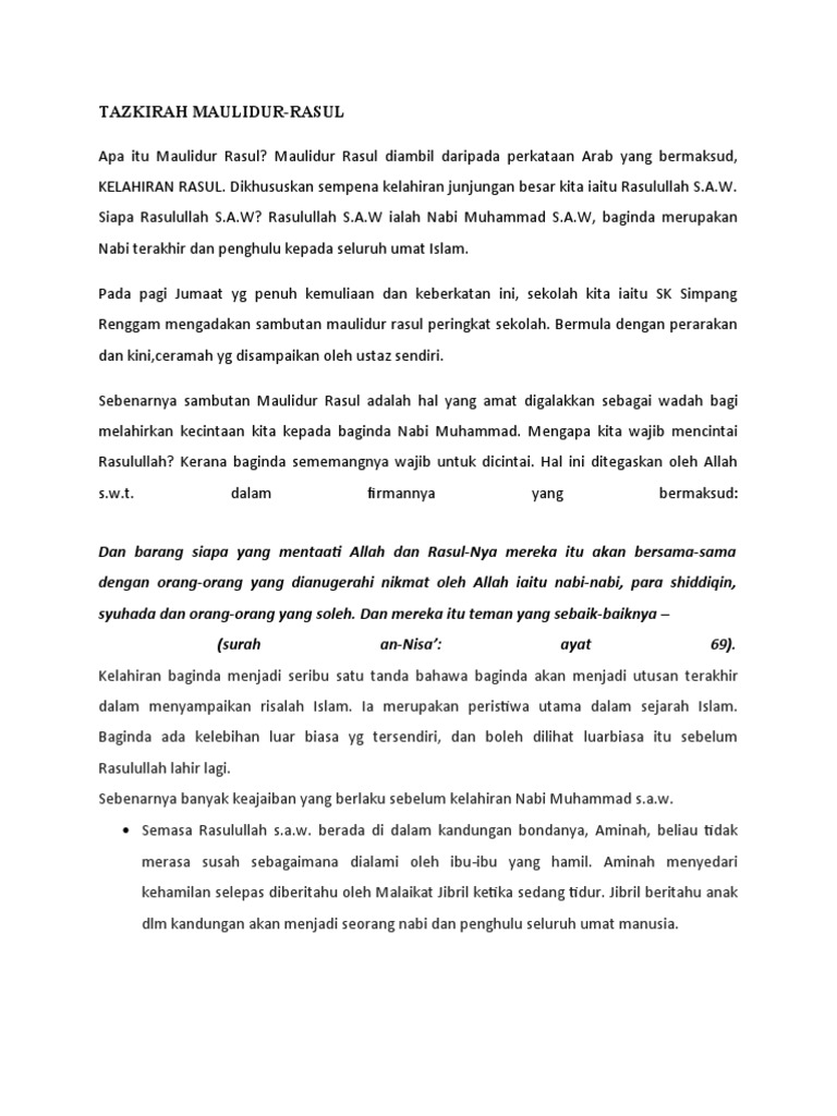 Pengertian maulidur rasul maulidur rasul ialah majlis memperingati keputeraan nabi muhammad sallallahu alaihi wasallam yang kebiasaannya disambut pada setiap 12 rabiulawal dengan mengadakan berbagai acara sambutan seperti perarakan ceramah dan berselawat bagi memuliakan junjungan besar umat islam dan sebagai tanda kecintaan kepada rasulullah sallallahu alaihi wasallam. Baginda merupakan nabi terakhir yang diutus oleh allah subhanahuwataala. Banyak kelebihan dan keistimewaan yang dikurniakan oleh allah swt kepada mereka yang mengadakan atau menghadiri majlis maulidur rasul.