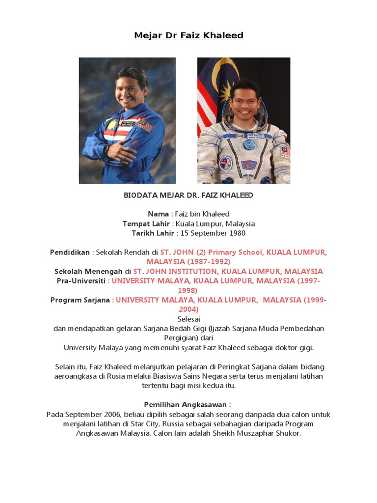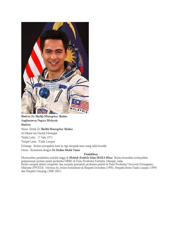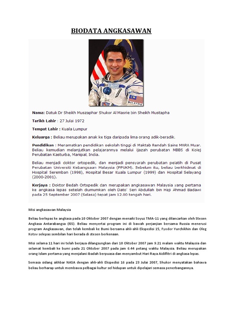 Biodata sheikh muszaphar shukor. Dilahirkan pada 27 julai 1972 merupakan doktor bedah ortopedik malaysia dan angkasawan malaysia yang pertama ke angkasa lepas setelah diumumkan oleh dato seri abdullah bin haji ahmad badawi kini bergelar tun pada 25 september 2007 selasa tepat jam 12 00. Leonov award 2010 by association of space explorers. Sheikh muszaphar shukor beliau berharap jika dapat diteruskan seorang teman lamanya dari star city dr faiz akan dipertimbangkan semula untuk program tersebut.