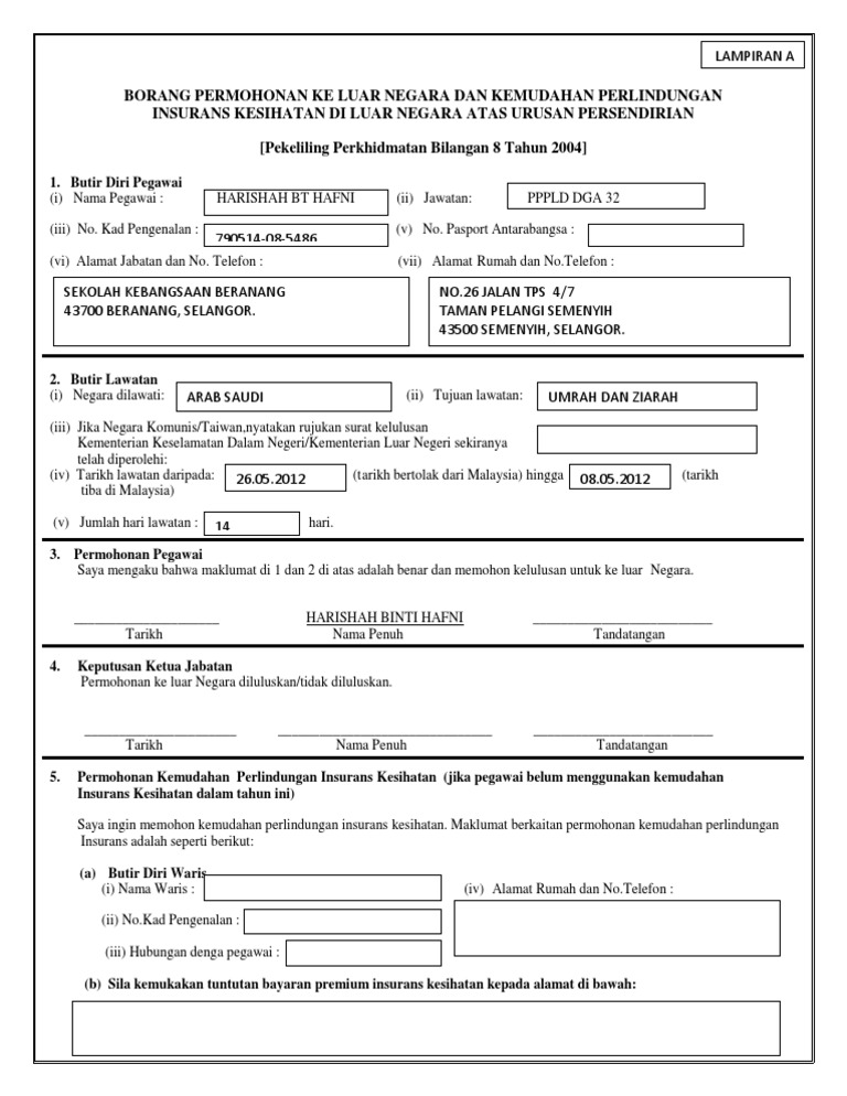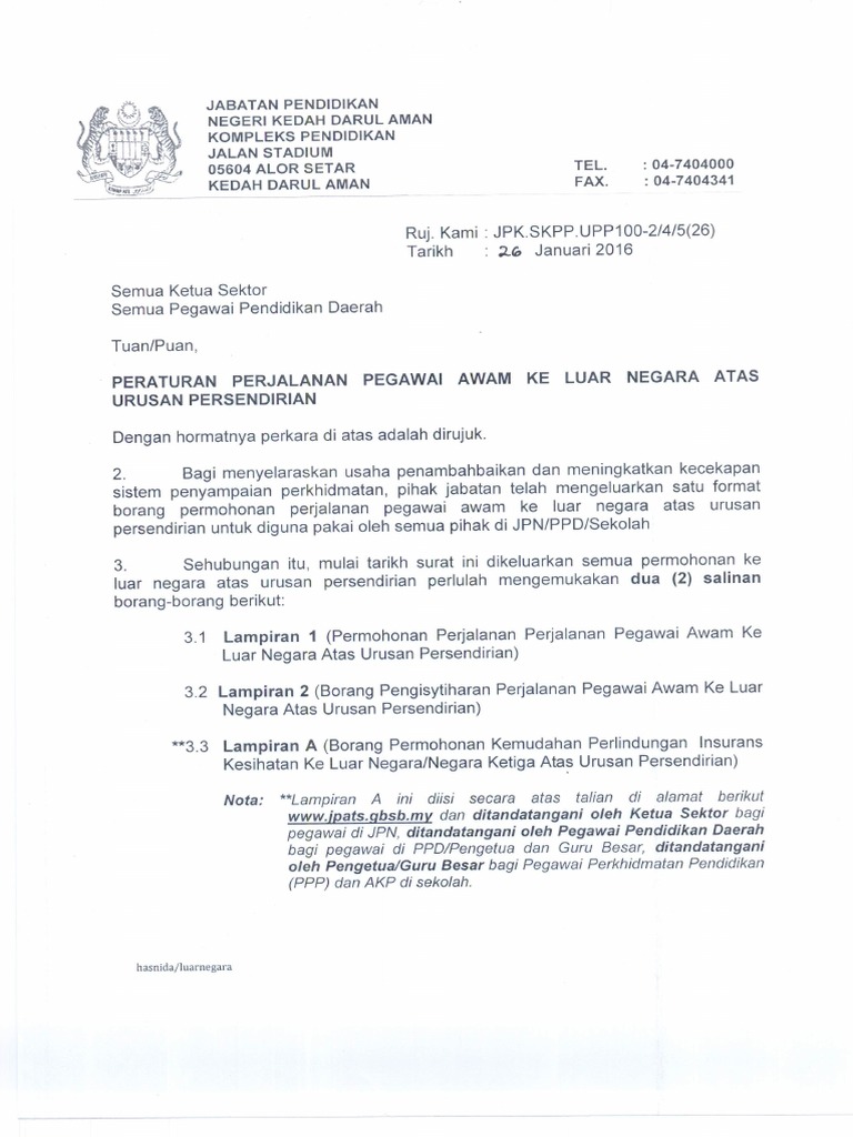 Nama ketua bahagian. 325 wp 3 2 lampiran a. 3 tahun 2012 mengenai peraturan perjalanan pegawai awam ke luar negara atas urusan persendirian permohonan lengkap perlu dikemukakan perlu disusuli dengan ketua jabatan penyokong masing masing selewat lewatnya satu 1 bulan sebelum tarikh perjalanan.