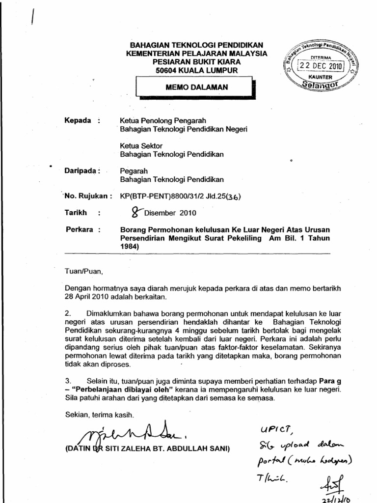 Salinan surat kelulusan ke luar negara disahkan oleh ketua jabatan 3 salinan. Syarat permohonan ke luar negara. Permohonan cuti rehat ke luar negara.