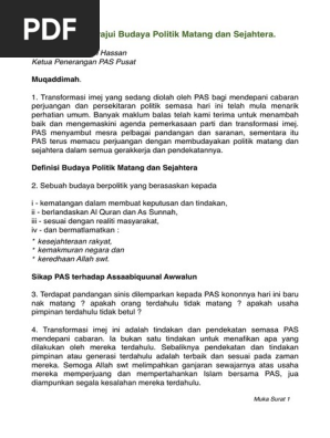 Muqaddimah transformasi imej yang sedang diolah oleh pas bagi mendepani cabaran perjuangan dan persekitaran politik semasa hari ini telah mula menarik perhatian umum. Pas sebagai parti islam bersedia membawa pendekatan politik islam ini ke pentas utama budaya berpolitik negara di bawah jenama budaya politk matang dan sejahtera bpms. Ia adalah anugerah allah swt untuk menyelamatkan dunia yang kacau bilau lantaran budaya politik kotor warisan jahiliyyah yang masih diterima pakai oleh sebahagian pengamal politik.