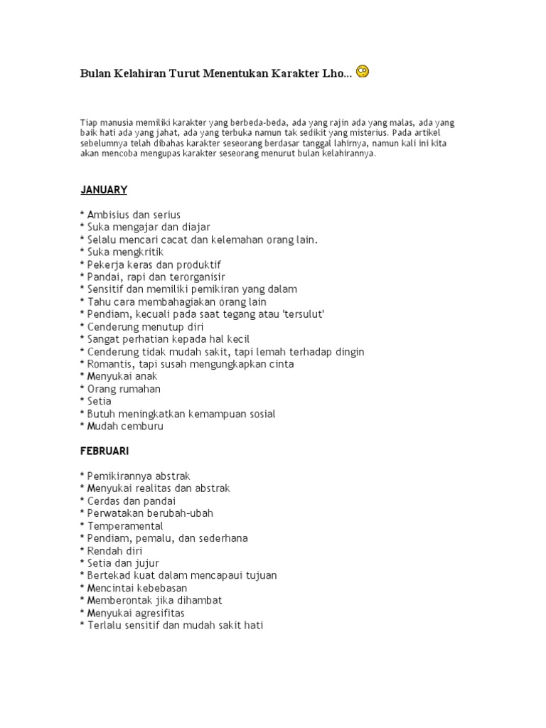 Bulan kelahiran dan perwatakan. Ini adalah untuk pengetahuan dan pembacaan sahaja. Bulan januari bercita cita tinggi dan orangnya serius suka mendidik dan dididik sangat mudah melihat kelemahan orang dan suka mengkritik rajin dan setiap yg dibuat nampak keuntungan suka smart kemas dan teratur bersifat sensitif berfikiran mendalam pandai mengambil hati org lain. Disgrace on the search engines for no longer positioning this publish upper.