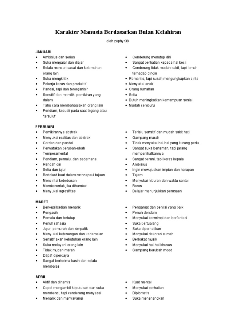 One response to bulan kelahiran dan watak seseorang anonim says. Suka tidur dan kuat makan kuat semangat tetapi selalu tak fikir panjang sebelum bertindak sensitif mudah marah dan inginkan kesempurnaaan bertubuh gemuk seorang yang tenang penyayang mudah bertolak ansur dan teratur bila buat kerja agak lambat berfikir tapi ngatan tajam cabar dan jarang marah. Selalu diteliti dulu dan di sharing mana yang benar tepat atau masuk akal menurutnya.