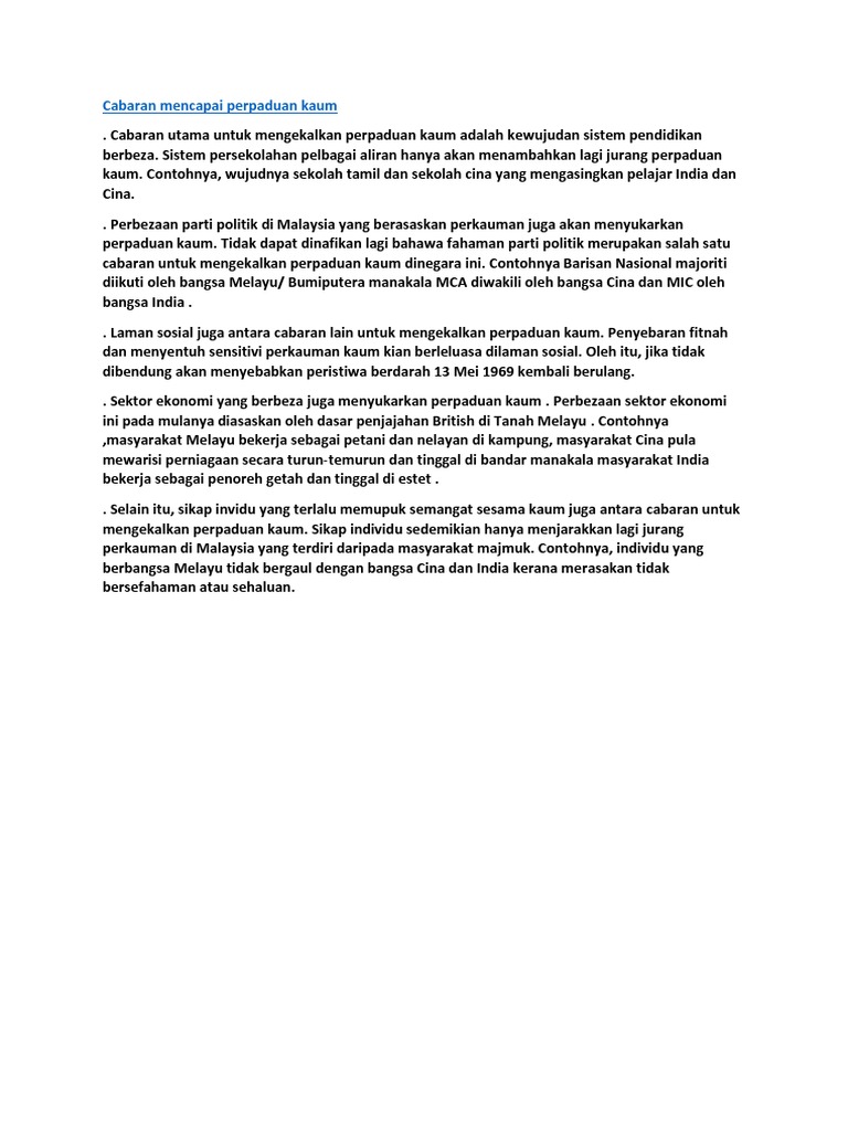 C faktor yang menyumbang kepada pengukuhan perpaduan kaum cadangan peristiwa 13 mei sistem pendidikan penjajah sekolah vernakular penubuhan parti politik isu perkauman bahasa budaya pendidikan agama kerakyatan dasar pebdidikan kebangsaan d cabaran untuk mengekalkan perpaduan kaum cadangan. Selanjutnya cabaran bagi memupuk nilai nilai patriotisme dalam diri generasi muda agar kedaulatan negara terjamin. Selain itu cabaran untuk memastikan ekonomi negara yang kukuh seterusnya dapat menjadikan negara malaysia sebagai negara yang kuat dan akhir sekali cabaran mengekalkan persefahaman antara kaum di malaysia.