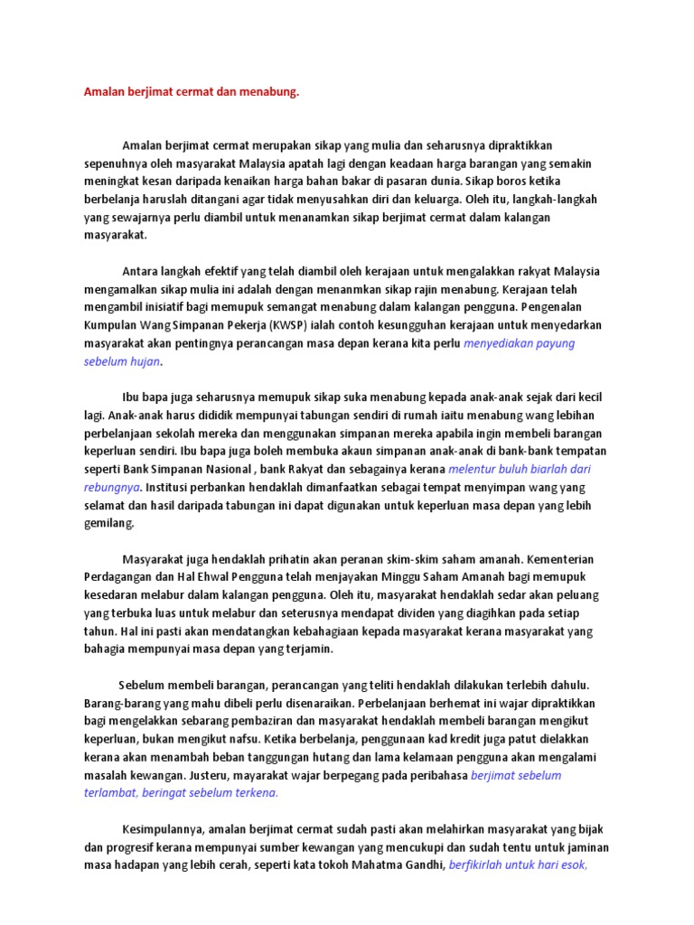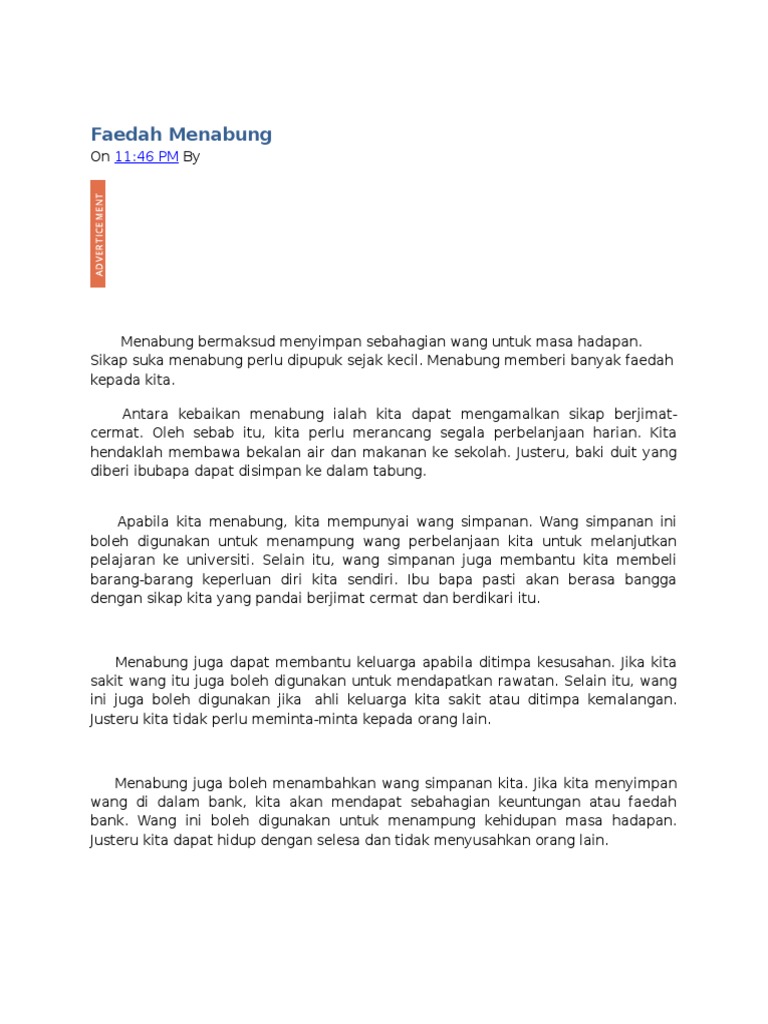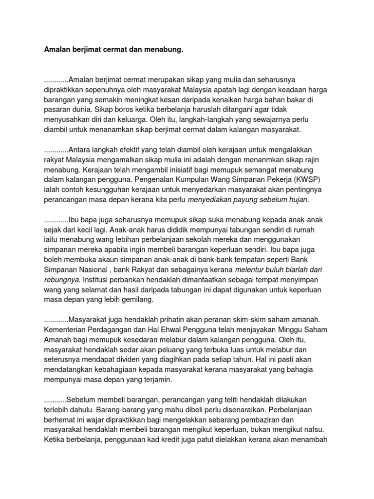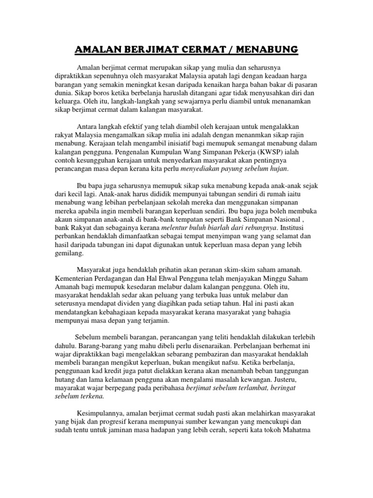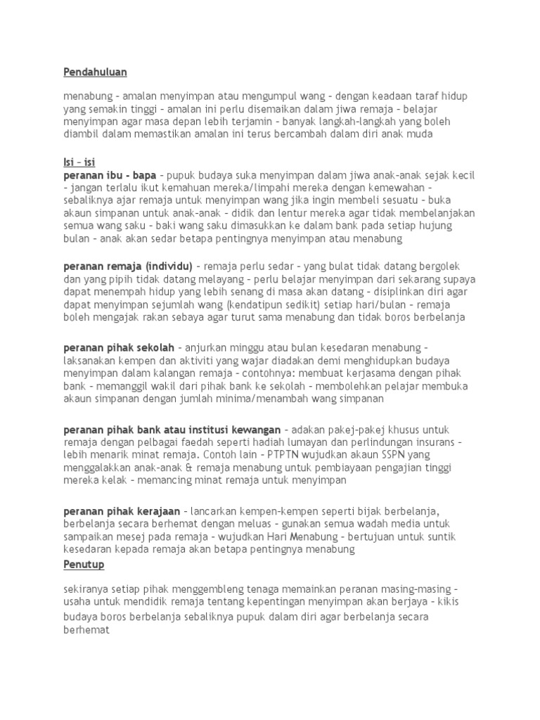Dijadikan bank kecil tidak mengharapkan orang lain untuk memberi wang. Menabung amalan menyimpan atau mengumpul wang dengan keadaan taraf hidup yang semakin tinggi amalan ini perlu disemaikan dalam jiwa remaja belajar menyimpan agar masa depan lebih terjamin banyak langkah langkah yang boleh diambil dalam memastikan amalan ini terus bercambah dalam diri anak muda. Konklusinya semua tindakan yang dijelaskan itu berupaya untuk memupuk sikap suka menyimpan dalam diri masyarakat terutama golongan muda.