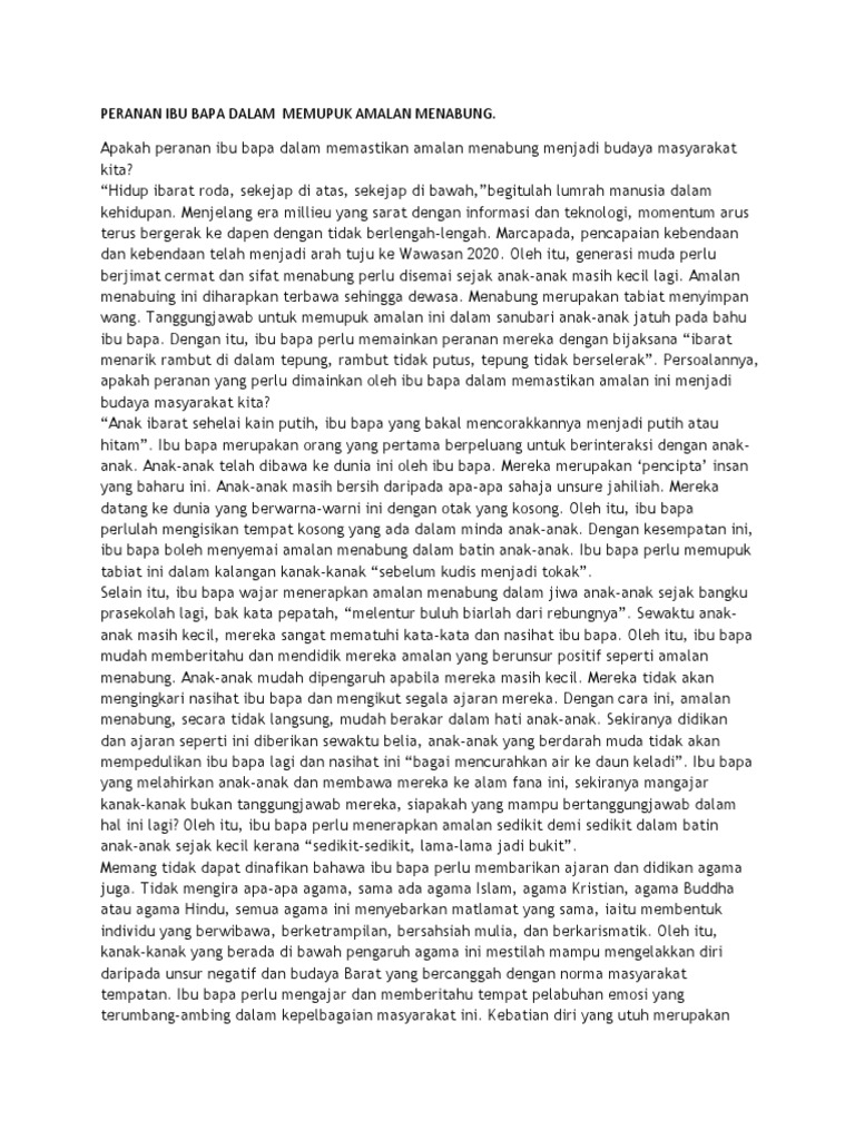 Tanggungjawab untuk memupuk amalan ini dalam sanubari anak anak jatuh pada bahu ibu bapa. Menabung adalah hal yang sangat bermanfaat bagi kehidupan kita oleh karena itu sangat penting untuk memupuk kebiasaan menabung semenjak usia dini. Amalan menabung sebenarnya mampu menjamin kestabilan hidup kita di dunia.