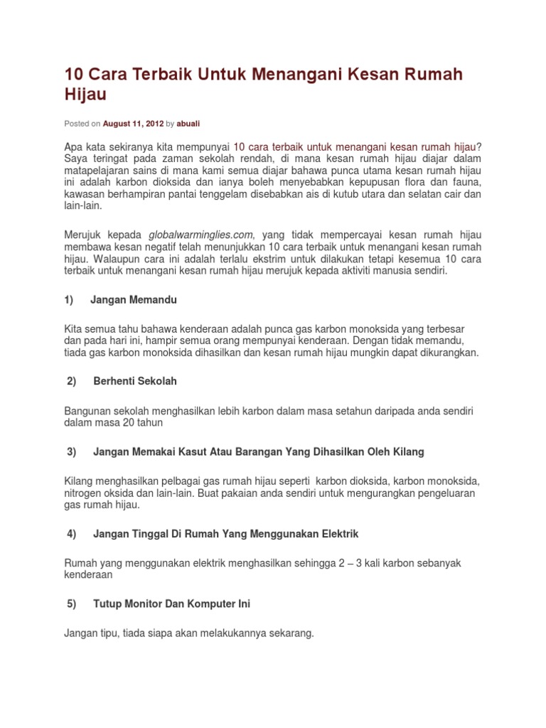 Mengenakan denda menguatkuasakan undang undang kepada pihak mencemarkan alam sekitar. 1 jangan memandu kita semua tahu bahawa kenderaan adalah punca gas karbon monoksida yang terbesar dan pada hari ini hampir semua orang mempunyai kenderaan. Rumah bagian dari wujud jati diri dan harga diri sehingga perlu diperhatikan.