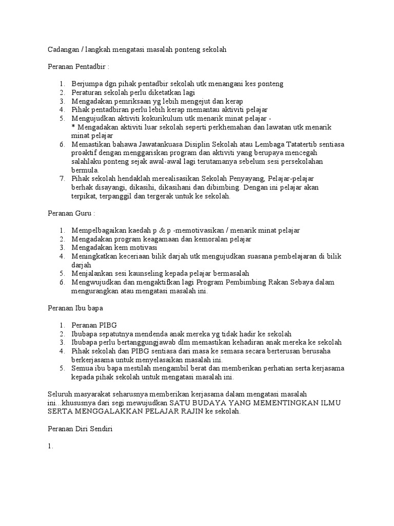 Peranan ibu bapa 3. Hal ini demikian kerana pihak sekolah merupakan pihak bertanggungjawab untuk mendidik atau mengajar mahupun membentuk akhlak pelajar di sekolah. Cara cara mengatasi masalah ponteng sekolah ponteng merupakan satu perbuatan salah laku dan melanggar peraturan sekolah.