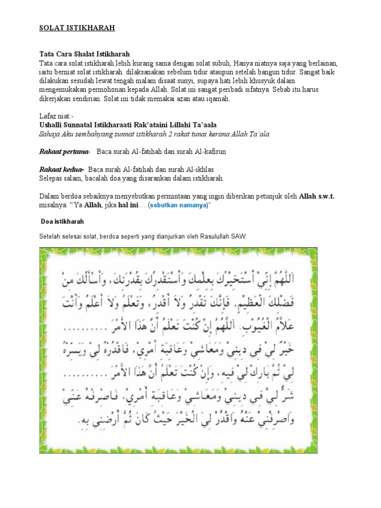 Cara menunaikan solat istikharah. Maka tidaklah mengherankan jika sering sekali dalam hidup kita dihadapkan pada pilihan pilihan yang sangat penting. Banyak hal yang mendasari orang mempelajari tata cara sholat istikharah. Sahaja aku sembahyang sunnat istikharah 2 rakat tunai kerana allah ta ala.