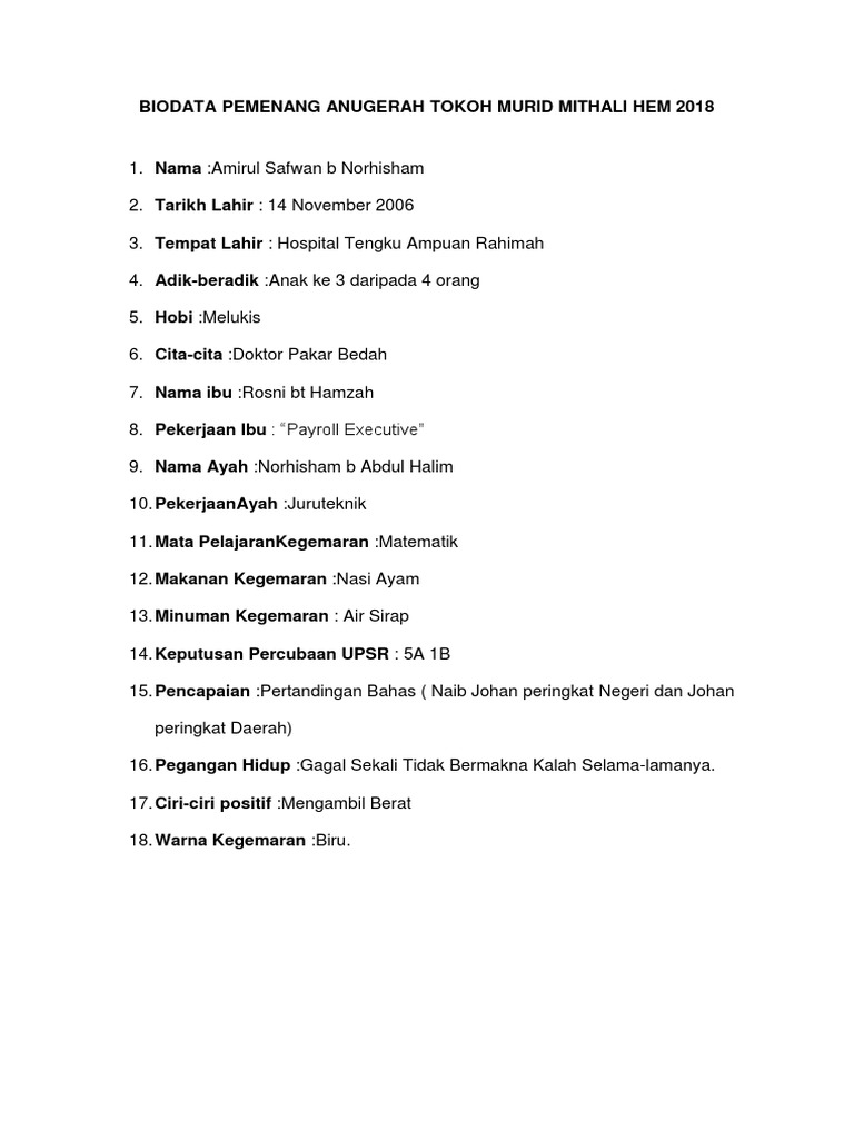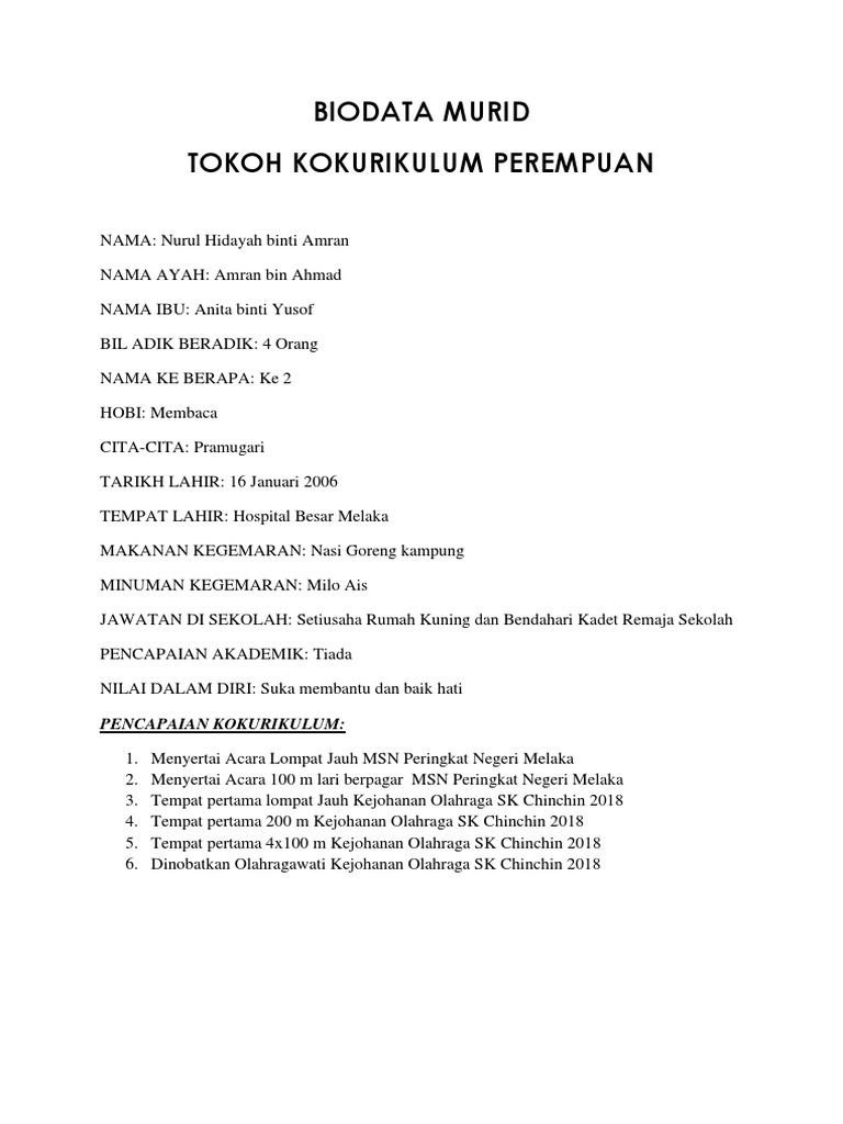 Contoh biografi guru 2 ania hariarti adalah seorang guru matematika yang lahir di solo pada 12 juni 1973 yang mengajar di sebuah sekolah menengah atas swasta di jombang. Biodata tokoh murid piala mutiara murid yang menerima tokoh murid ini dilahirkan pada 05 ogos 1999 tepat jam 12 06 tengah hari di pusat perubatan pantai kuala lumpur. Related posts to contoh biodata tokoh murid sekolah rendah contoh biodata tokoh murid sekolah rendah 2018 05 27t21 41 00 07 00 rating.