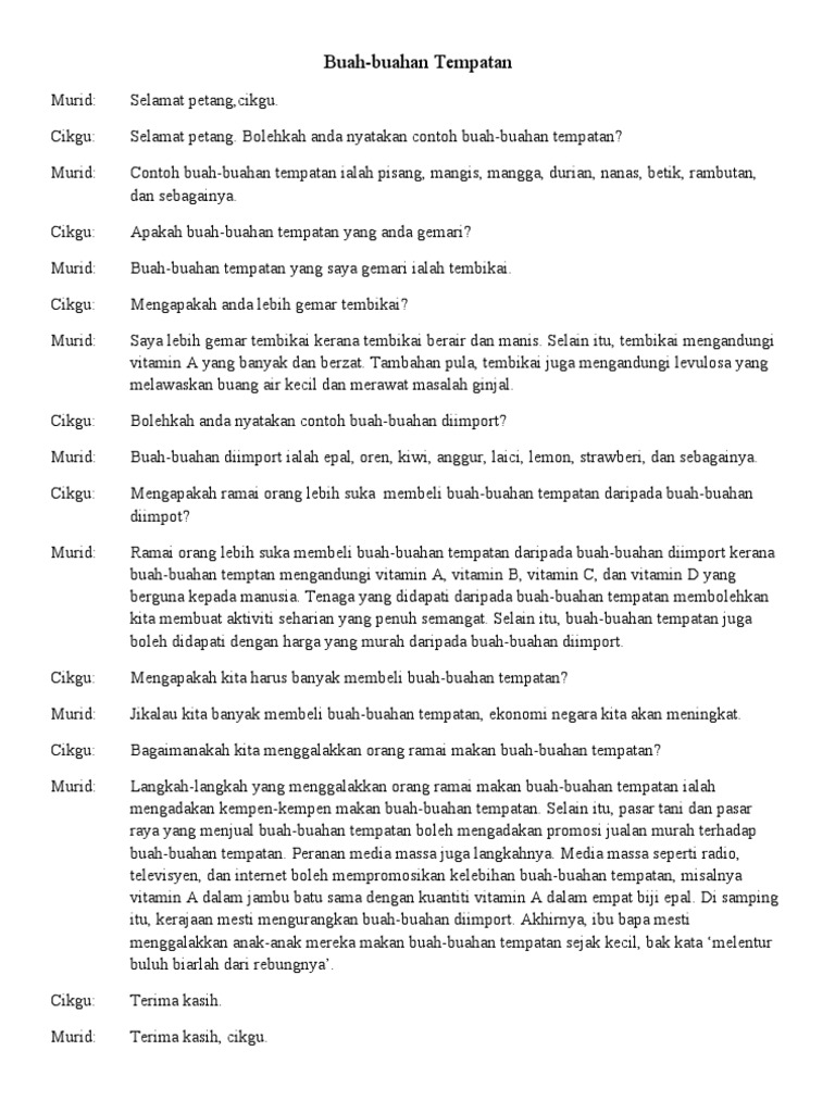 Pada pagi yang mulia ini saya ingin menyampaikan sebuah syarahan yang bertajuk faedah makan buah buahan tempatan. Buah buahan tempatan merangkumi buah rambutan mangga manggis tembikai betik dan lain lain lagi buah buahan tempatan amat bernutrien dan mengandungi vitamin yang tinggi contohnya jambu batu mengandungi vitamin c dan agen pencegah penyakit selain itu vitamin c juga dapat menyembuhkan luka dengan cepat buah buahan tempatan seperti limau oren dan sebagainya juga mengandungi bahan antioksidan zat. Jika masyarkat didedahkan dengan khasiat makan buah buahan tempatan sudah pasti masyarakat tidak ragu ragu untuk memakannya.