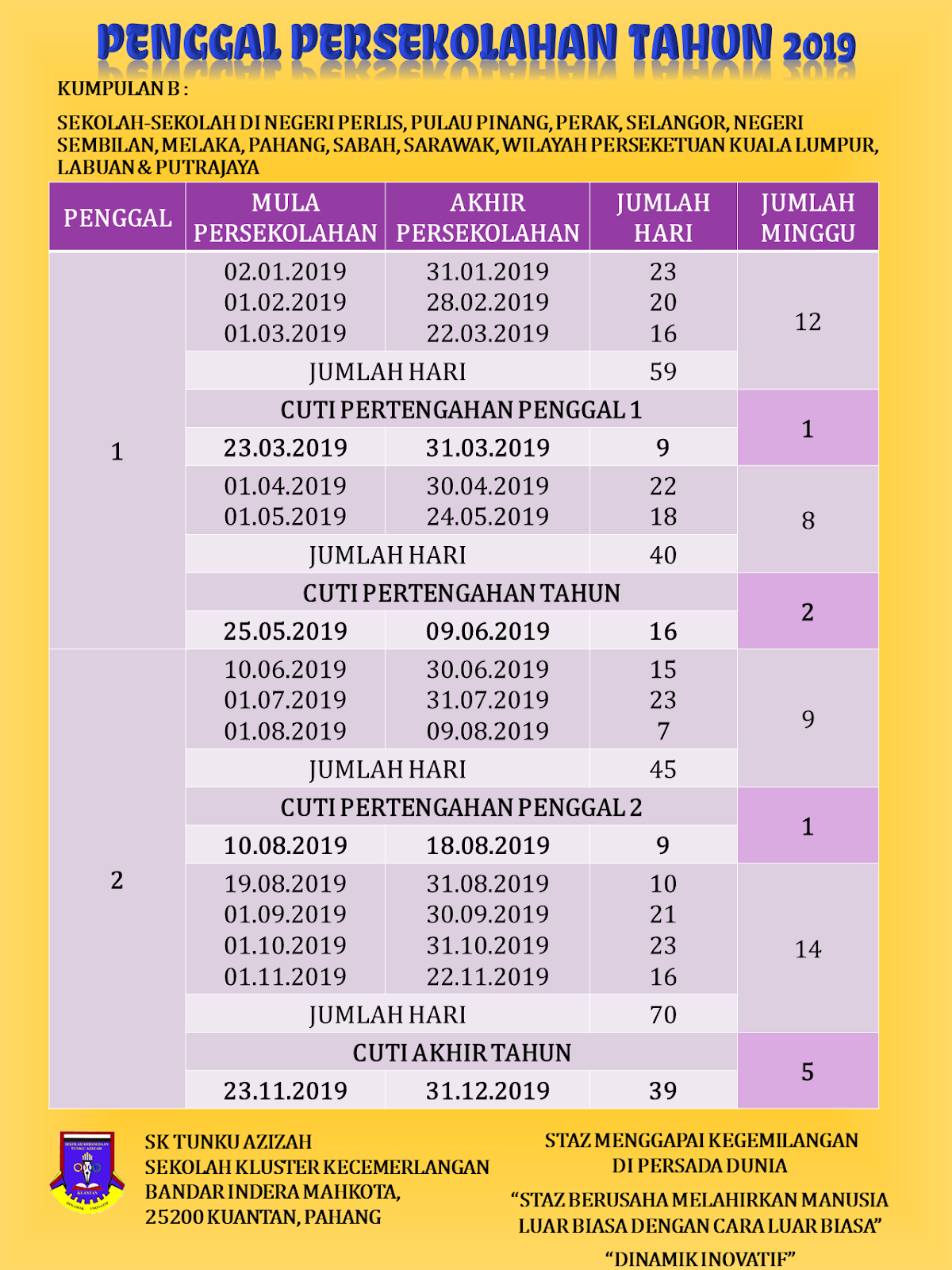 Takwim sekolah mula akhir. Berikut kami kongsikan tarikh tarikh cuti sekolah 2018 untuk rujukan ibu bapa yang ingin merancang program atau percutian bersama keluarga tahun hadapan. Selain itu sebelum cuti kebiasaanya pihak sekolah akan mengadakan.