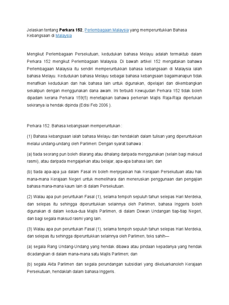 Perlembagaan persekutuan perlembagaan persekutuan cetakan semula sebagaimana pada 1 november 2010 teks ini hanyalah terjemahan oleh jabatan peguam negara bagi federal constitution. Melainkan jika dan sehingga ditetapkan sahih di bawah perkara 160b perlembagaan persekutuan teks ini bukan perundangan. Perkara 152 perlembagaan malaysia memperuntukkan bahasa kebangsaan di malaysia ialah bahasa melayu kedudukan bahasa melayu sebagai bahasa kebangsaan bagaimanapun tidak menafikan kedudukan dan hak bahasa lain untuk digunakan dipelajari dan dikembangkan sekalipun dengan menggunakan dana awam.