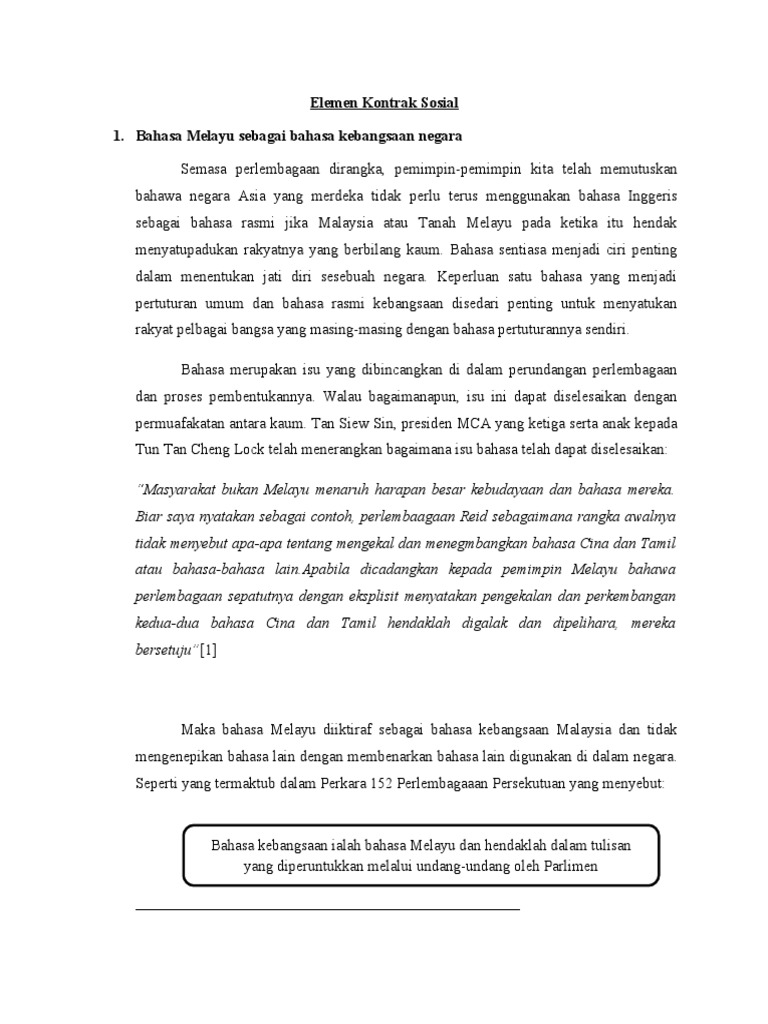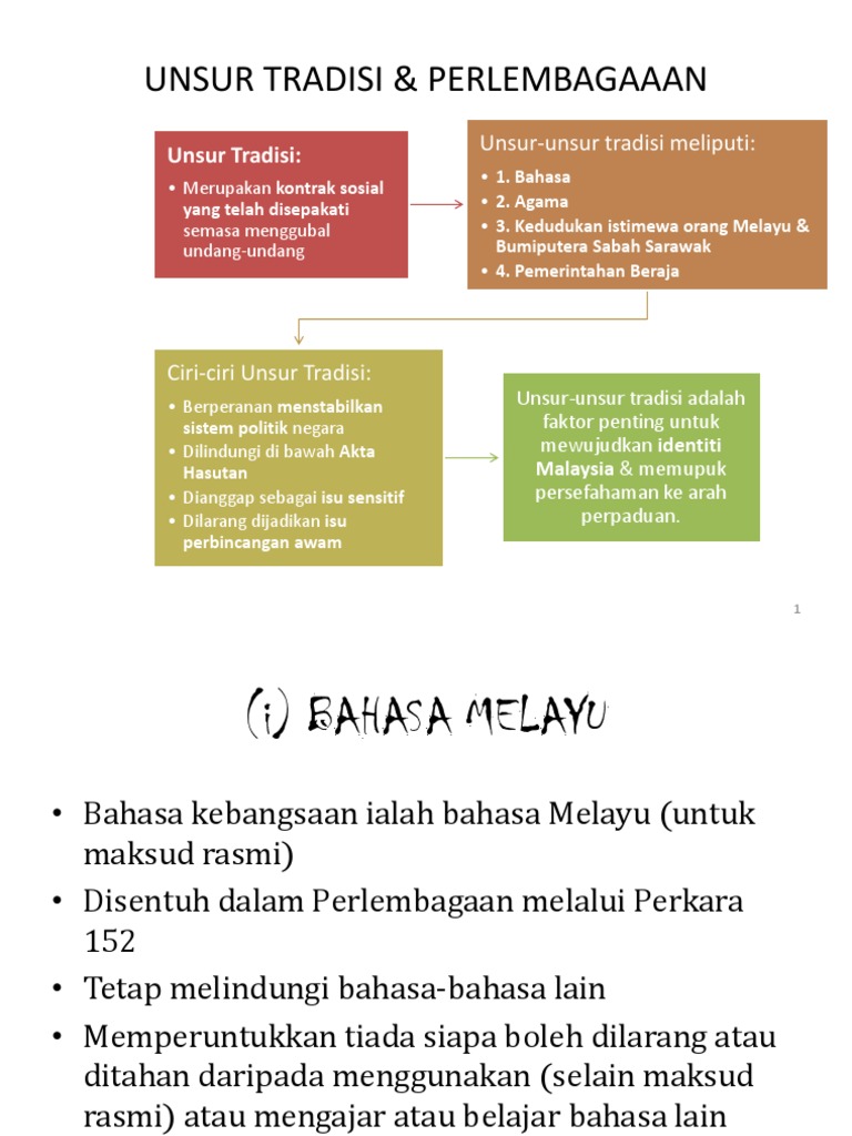 Perlembagaan persekutuan menjadi lebih unik dengan terdapatnya unsur unsur tradisi seperti bahasa kebangsaan kedudukan istimewa orang melayu agama persekutuan dan institusi beraja. Kedudukan bahasa melayu sebagai bahasa rasmi dan bahasa kebangsaan sudah termaktub dalam perkara 152 perlembagaan persekutuan. Kedudukan bahasa melayu telah termaktub dalam perkara 152 perlembagaan persekutuan yang memperuntukkan bahasa melayu mestilah digunakan untuk maksud maksud rasmi.