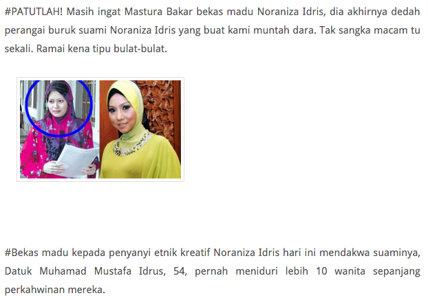 Ajk umno tasek gelugur meniduri lebih 10 wanita bekas madu kepada penyanyi etnik kreatif noraniza idris hari ini mendakwa suaminya datuk muhamad mustafa idrus 54 yang juga ahli jawatan kuasa umno tasek gelugor pernah meniduri lebih 10 wanita sepanjang perkahwinan mereka. Son of syed ahmad al idrus father of mustafa datuk bukit tumbuh and idrus tukku darat managed by.