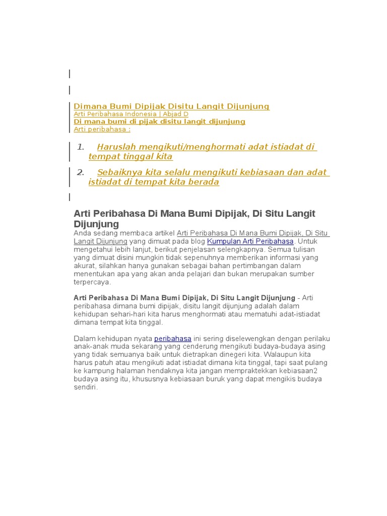 Arti peribahasa di mana bumi dipijak di situ langit dijunjung arti peribahasa dimana bumi dipijak disitu langit dijunjung adalah dalam kehidupan sehari hari kita harus menghormati atau mematuhi adat istiadat dimana tempat kita tinggal. Sejak menikah oktober 1996 pun saya dan istri tinggal di gubuk kami berdua di kreo. Di mana bumi dipijak di situ langit dijunjung.