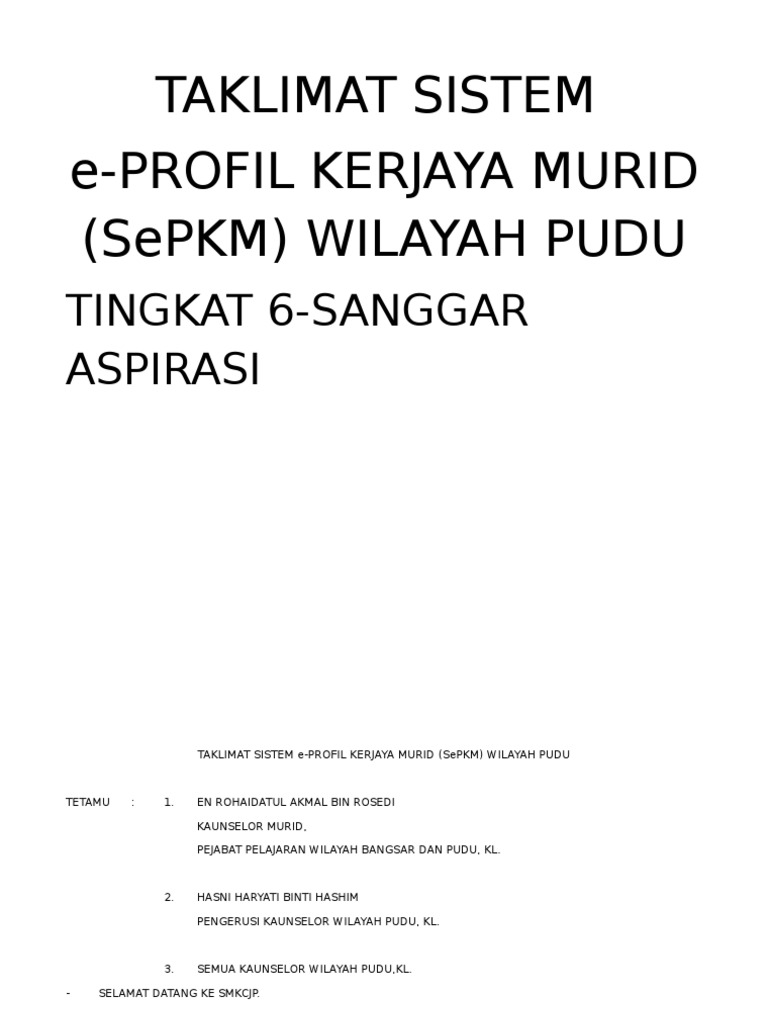 Taklimat sistem e profil kerjaya murid sepkm peringkat negeri. Anda perlu hidupkan javascript untuk melihatnya. Maklumat lanjut sila hubungi encik mohd zakaria bin zain penolong pengarah bimbingan kaunseling di talian 012 573 3600.