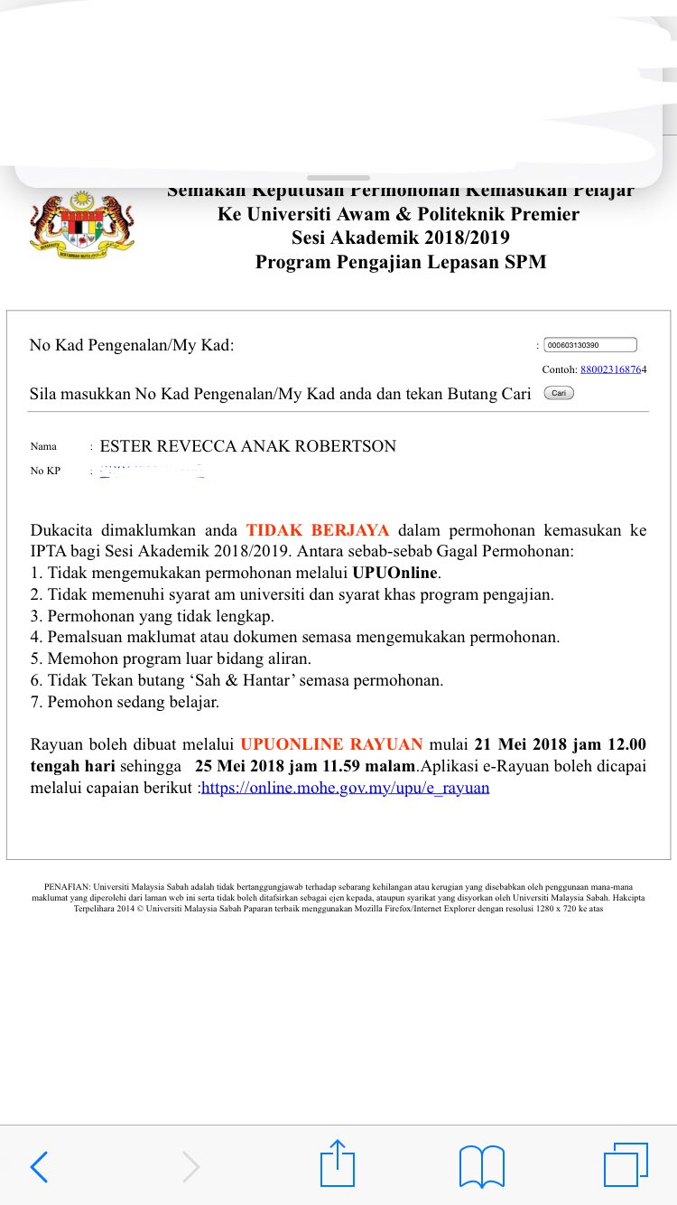 E rayuan upu 2018. Berikut adalah maklumat berkaitan semakan rayuan upu sesi ambilan 2020 2021 buat rujukan pelajar. May 27 2018 informasi semakan upu. Result rayuan ua ipta politeknik premier politeknik konvensional metro kolej komuniti dan ilka.