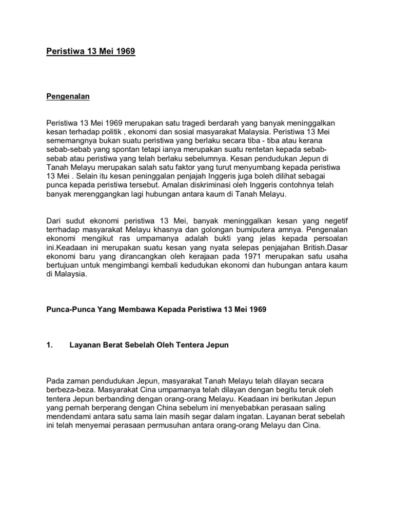 Begitu tragis peristiwa yang berlaku pada 13 mei 1969 sehingga sekarang ia menjadi sebutan. Peristiwa 13 mei pada tahun 1969 ialah insiden rusuhan kaum yang berlaku dan kemuncak masalah perpaduan di malaysia. Gambar hiasan pendidikan pendidikan di negara kita sebelum peristiwa 13 mei 1969 juga dilihat tidak ada unsur unsur keadilan u.