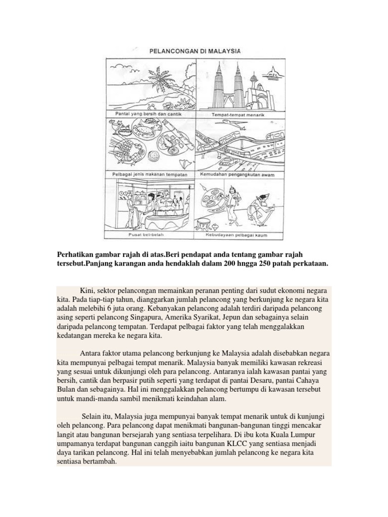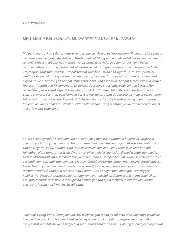 Beliau juga menyatakan tarikan sesuatu tempat pelancongan di jangka oleh potensi pelancong dan ia membekalkan motivasi serta daya tarikan kepada pelancong untuk datang. Karangan spm pelancongan. Justeru keunikan budaya masyarakat di malaysia telah berjaya menjadi daya tarikan kepada para pelancong untuk berkunjung ke negara kita.