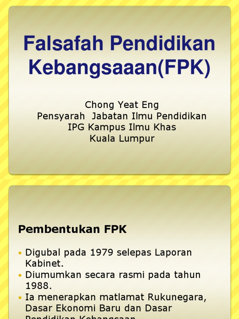 Falsafah pendidikan negara fpn secara bertulis telah digubal pada tahun 1987 dan diperkenalkan pada tahun 1988. Falsafah pendidikan kebangsaan fpk yang dulunya dikenali sebagai falsafah pendidikan negara fpn telah digubal secara keseluruhannya dengan rapid an teliti oleh pakar pakar pendidikan. Falsafah pendidikan kebangsaan dahulunya dikenali sebagai falsafah pendidikan negara.