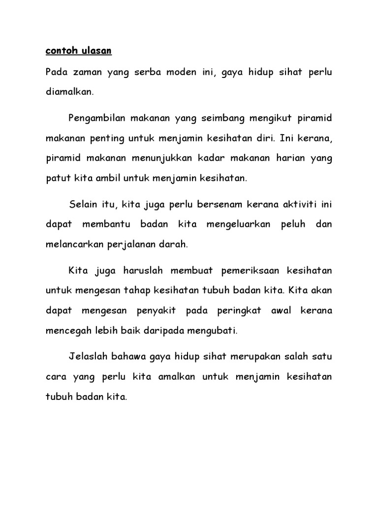 Gaya hidup sihat ulasan. Ulasan bina ayat 1. Amalan gaya hidup sihat harus diamalkan dalam kehidupan seharian. Pengambilan makanan yang seimbang mengikut piramid makanan penting untuk menjamin kesihatan diri.
