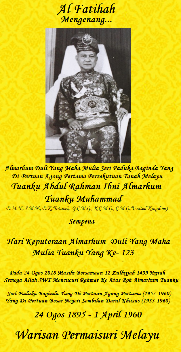 Yang di pertuan agong raja permaisuri agong tempoh pemerintahan negeri 1 tuanku abdul rahman ibni almarhum tuanku muhammad. 31 ogos 1957 1 april 1960. 8 jun telah pun diisytiharkan sebagai hari kelepasan am bersempena hari keputeraan rasmi yang di pertuan agong al sultan abdullah ri ayatuddin al mustafa billah shah.