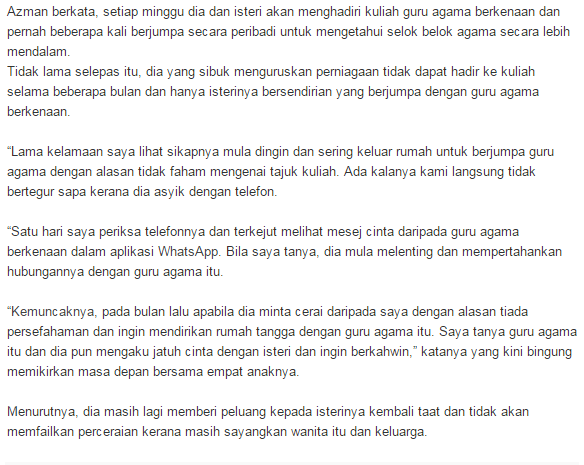 Saya berusia 20 an ketika itu dan tidak kuat menghadapi dugaan. Seperti kisah yang berlaku di sambhal daerah uttar pradesh india ini si isteri minta cerai tanpa sebab selepas 18 bulan berkahwin dek kerana suaminya cukup menyayangi si isteri. Ramai yang beritahu saya berdosa isteri minta cerai.