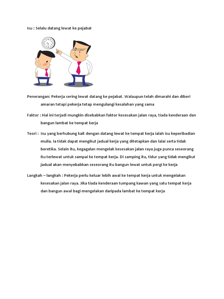 Isu datang lewat ke tempat kerja. Pekerja bermasalah ini selalunya ponteng kerja lewat masuk kerja tidak memberi komitmen terhadap tugasan tidak mematuhi arahan anda sebagai majikan atau bos tidak menghormati ketua tidak amanah suka menganiaya pekerja lain dan berbagai lagi kesalahan yang boleh menjejaskan perniagaan anda. Antara soalan yang kerap menjadi bahan pertanyaan adalah berkenaan masalah datang lambat ke tempat kerja. 1 selalu datang lewat ke pejabat hal ini terjadi mungkin disebabkan fakor kesesakan jalan raya tak ada kenderaan dan bangun lambat ke tempat kerja.
