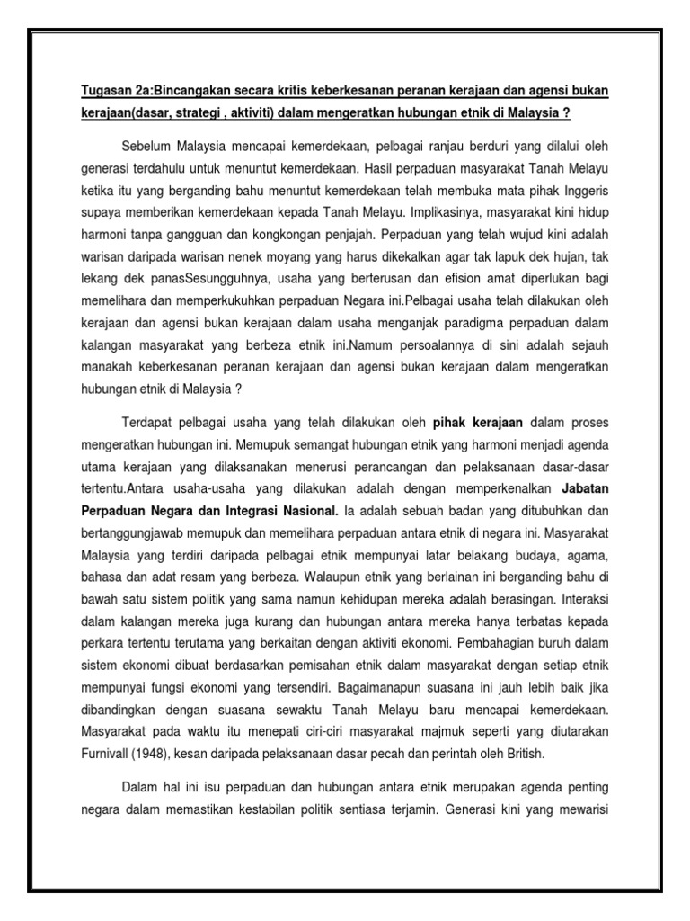 Kekuatan hubungan yang terjalin antara etnik ini sebenarnya bukanlah untuk dihuraikan kepada orang luar tetapi yang penting kepada. Pdf on feb 19 2015 padly alpatanni published hubungan etnik di malaysia. Hubungan etnik di malaysia 5 zaman darurat hingga pembentukan malaysia menjadi semakin rumit selepas darurat diisytiharkan terutama antara kaum melayu dan cina semakin teruk selepas british memperkenalkan rancangan penempatan semula yang membataskan pergaulan kaum melayu yang ditempatkan di kampung melayu dan cina di kampung baru isu utama politik ketika ini seperti penguasaan.