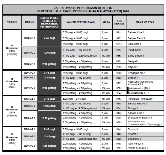 Jadual peperiksaan stpm 2019 terkini. Stpm semester 1 2019 peperiksaan bertulis. Jadual peperiksaan sijil tinggi persekolahan malaysia 2020 2021.