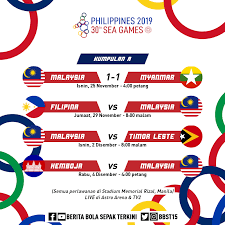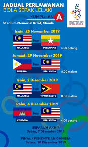 Jadual perlawanan bola sepak sukan sea 2019. Sea games 2019 jadual perlawanan bolasepak. November 28 2019 at 8 41 pm baca juga. Melalui platform ini infosentral akan merekodkan setiap keputusan perlawanan bola sepak sukan sea 2019 terutamanya bagi pasukan malaysia disamping mengemaskini jadual dan kedudukan carta sehingga perlawanan akhir final sukan sea yang dijadual berlangsung pada 10 disember 2019.