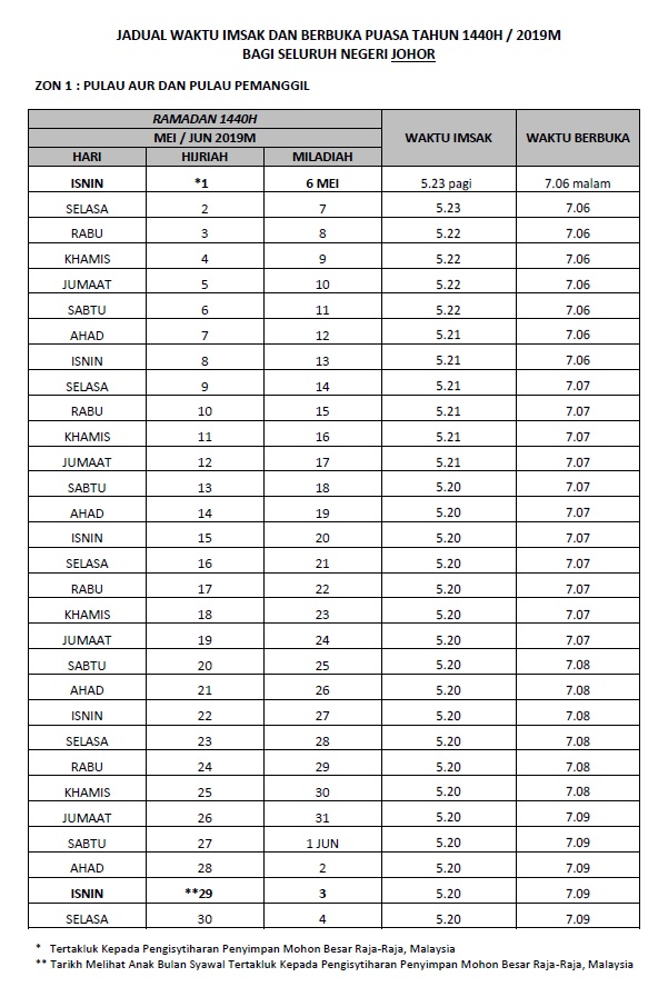 Daerah johor bahru kulai kota tinggi mersing dan pulau pulau yang berdekatan dengannya ramadan 1440h mei jun 2019m waktu imsak waktu berbuka hari hijriah miladiah isnin 1 6 mei 5 27 pagi 7 08 malam selasa 2 7 5 27 7 08.