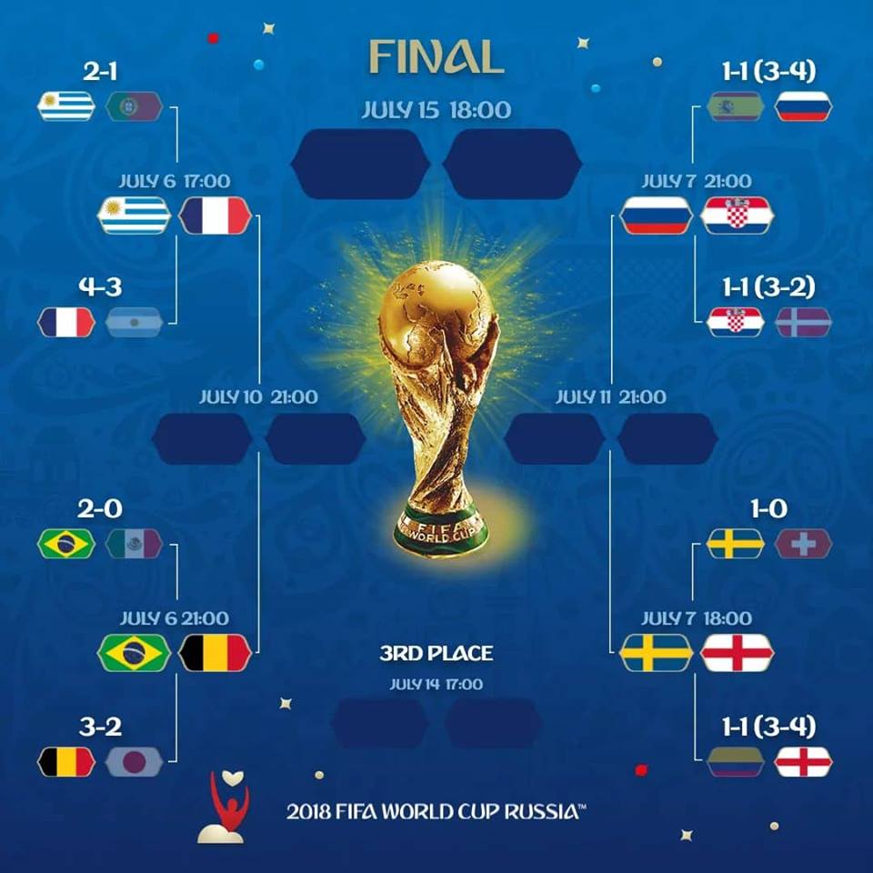 Semoga perkongsian jadual dan keputusan suku akhir piala dunia 2018 ini dapat dijadikan rujukan buat peminat bolasepak di malaysia. Sabtu 14 julai 2018 10 pm live rtm astro arena. Takziahlah buat para penyokong pasukan pasukan yang tidak berjaya ke peringkat suku akhir piala dunia.