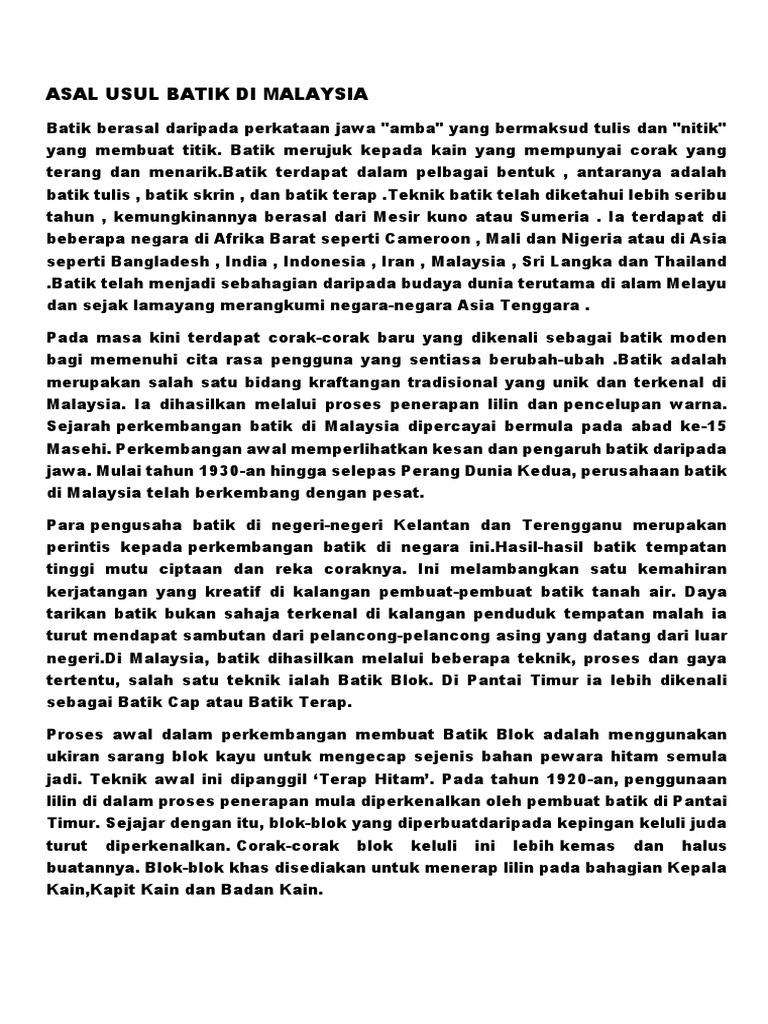 Awalnya batik diklaim punya malaysia. Karena batik itu adalah teknik atau proses. Batik berasal dari indonesia dan perkataan batik terbit dari perkataan jawa tik yang bermaksud menitik atau menulis titik titik.