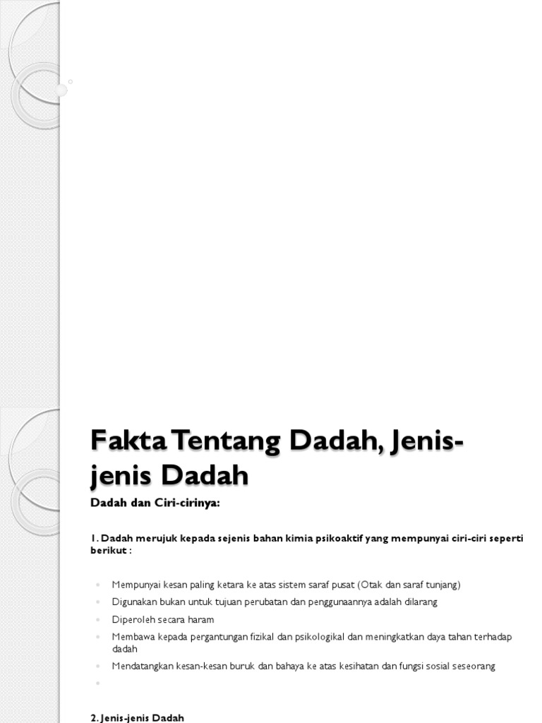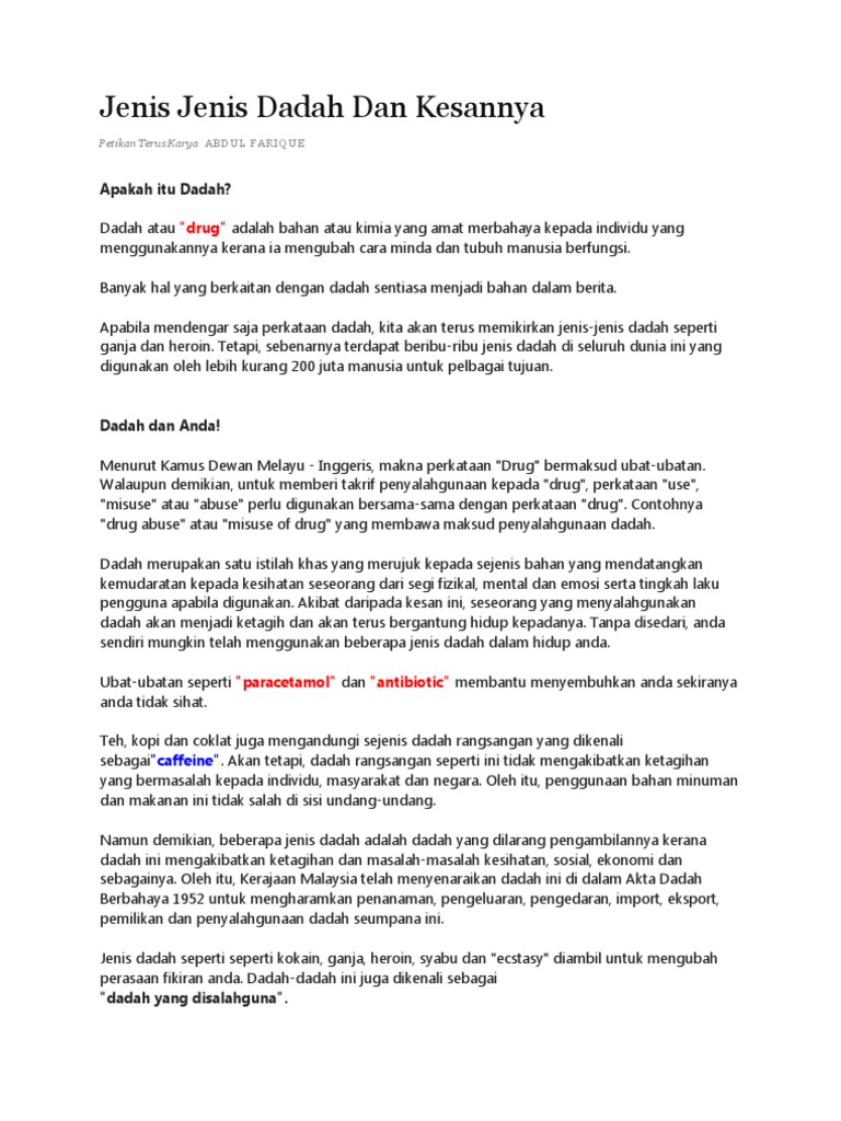 Jenis dadah dan kesan. Oleh itu kerajaan malaysia telah menyenaraikan dadah ini di dalam akta dadah berbahaya 1952 untuk mengharamkan penanaman pengeluaran pengedaran import eksport pemilikan dan penyalahgunaan dadah seumpana ini. Dadah dan ciri cirinya dadah merujuk kepada sejenis bahan kimia psikoaktif yang mempunyai ciri ciri seperti berikut. Dadah terbahagi kepada tiga jenis yang utama iaitu sedatif perangsang dan halusinogen.