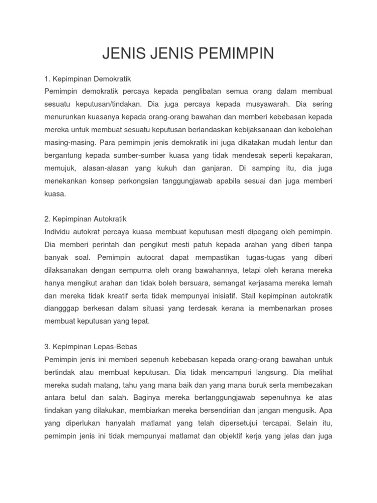 Jenis Jenis Kepimpinan