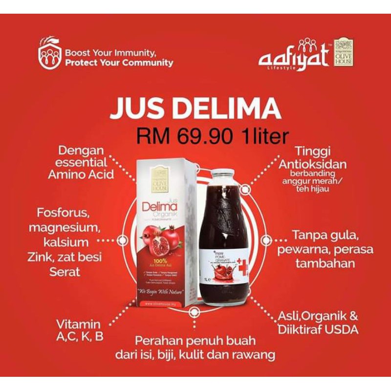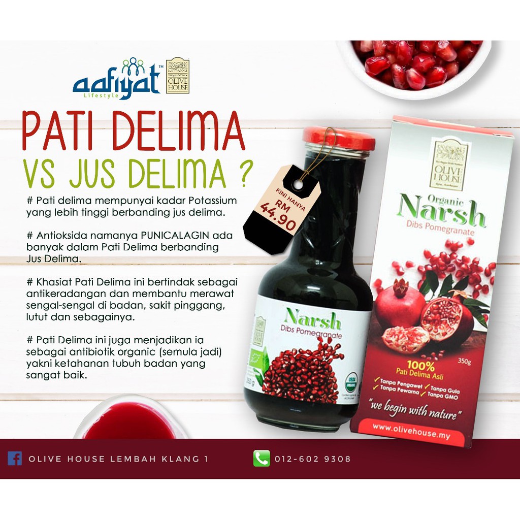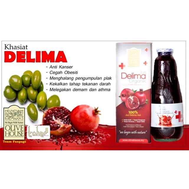 Jus delima olive house. Pati delima jus delima pekat. Ini menjadikannya kaya dengan kandungan vitamin dan mikro elemen serta memberikan rasa masam semulajadi. Jus delima olive house boleh didapati dalam jenis saiz iaitu 200ml dan 1 liter manakala pati delima dalam saiz 350ml.