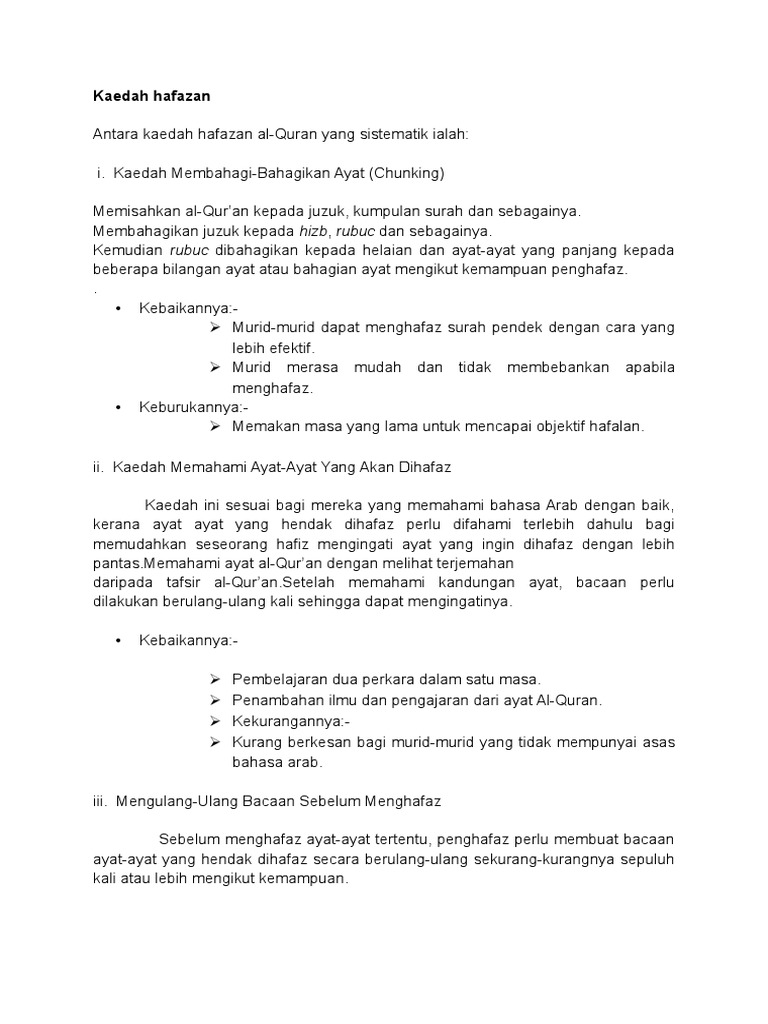 Ini boleh menjimatkan masa dan dapat meningkatkan peluang setiapmurid mendapat bimbingan kaedah pengajaran hafazan al quranbidang hafazan al quran bermula semenjak penurunan ayat al quran yang pertama ketika rasullulah s a w. Dalam usaha menghafaz al quran dan menjaga hafazan yang diperolehinya. Menghafaz memerlukan suatu kekuatan fikiran pada orang yang melakukannya.