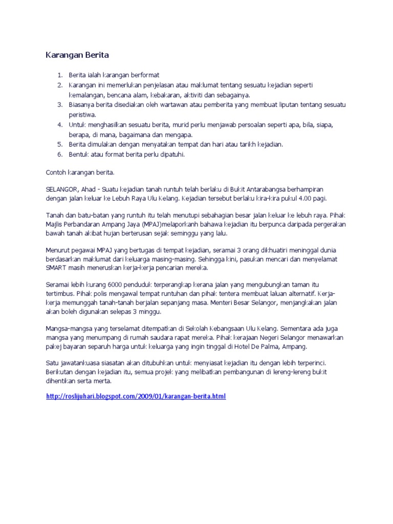 Karangan berita kemalangan jalan raya. Pendek kata kecuaian pemandu ketika di jalan raya merupakan penyumbang utama kemalangan jalan raya. Contoh karangan usaha usaha menangani kemalangan jalan raya pemandu tertidur mengakibatkan lorinya melanggar sebuah kereta. Kuala lumpur 8 april satu kemalangan jalan raya telah berlaku di jalan kuching kira kira pada pukul 3 30 petang.