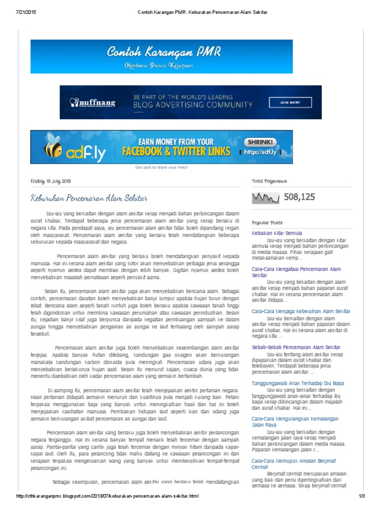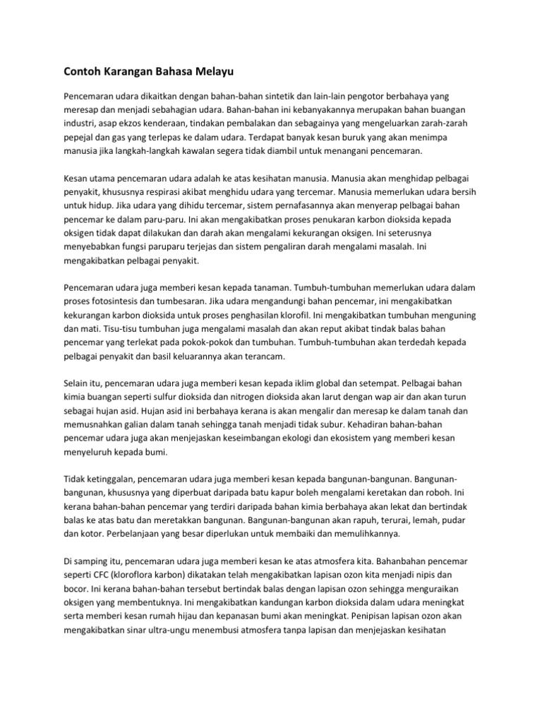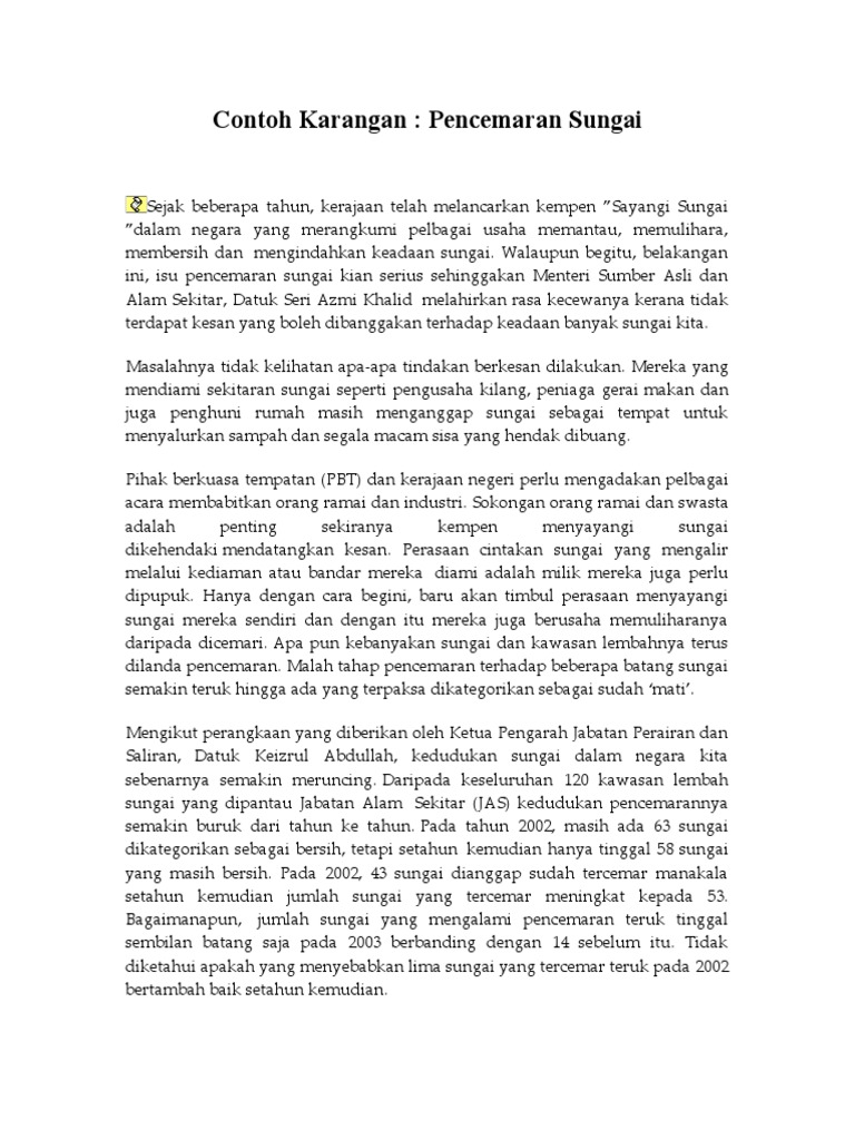 Contoh karangan punca punca pencemaran alam sekitar pendahuluan dalam meniti kerancakan arus pemodenan pada era pascaperindustrian dan pascaglobalisasi yang serba mencabar akal dan minda ini telah membuatkan kita alpa akan tanggungjawab kita menghargai serta memelihara keindahan alam semula jadi. Pencemaran udara nyata memberikan heterogen impak kepada manusia sekiranya sampah sarap dan sisa toksik terus dihumban ke dalam punca utama aliran air iaitu sungai dan laut. Pencemaran pada hari ini semakin berterusan dari semasa ke semasa.