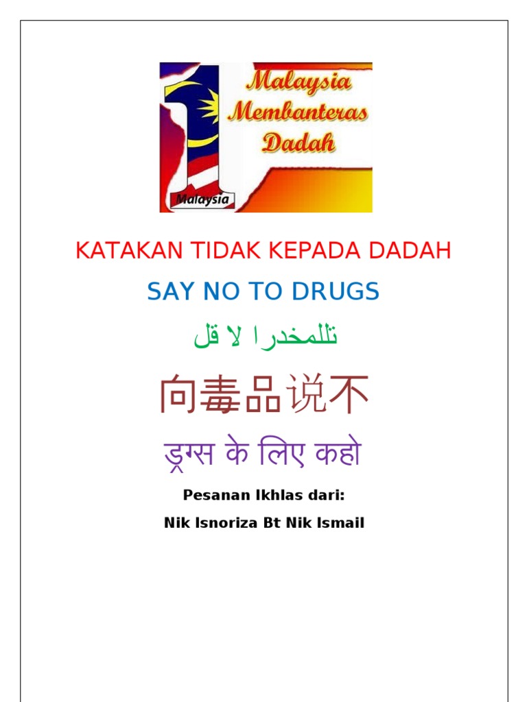 Dadah ajar belia untuk katakan tidak kepada dadah pastikan anak anda tahu bahawa penyalahgunaan dadah bukanlah perkara biasa di singapura dan tidak. Katakan tidak pada dadah. Don t meth with me.