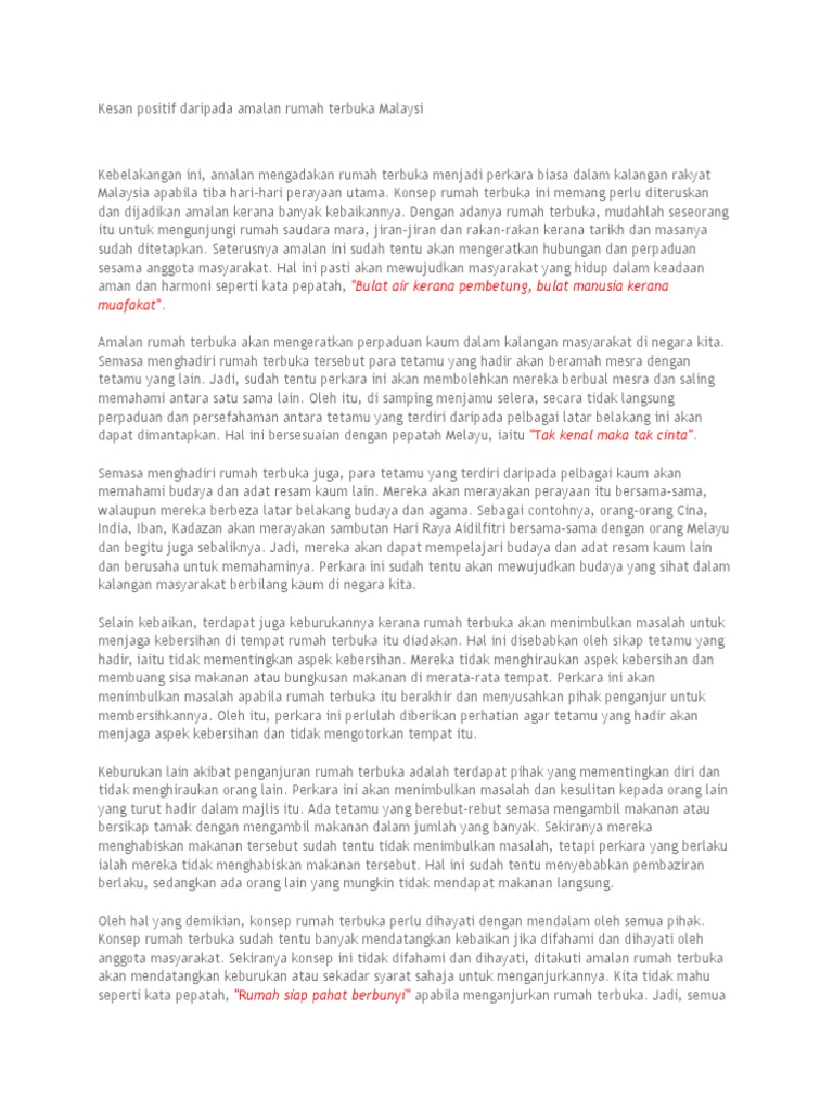 Huraikan kebaikan dan keburukan mengadakan rumah terbuka. Oleh itu sudah pasti amalan ini dapat mengeratkan hubungan silaturrahim seperti isi dengan kuku. Lain 3 dapat menjayakan konsep satu malaysia yang didukung oleh perdana menteri 4 bertukar tukar pendapat 5 saling ziarah menziarahi kaum lain 6 menghormati soalan contoh sewaktu sambutan hari raya aidilfitri yang lalu anda telah mengunjungi rumah terbuka yang.
