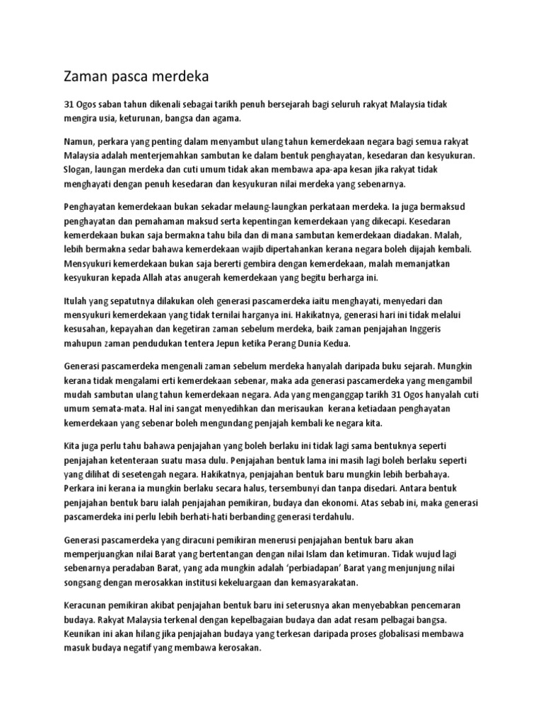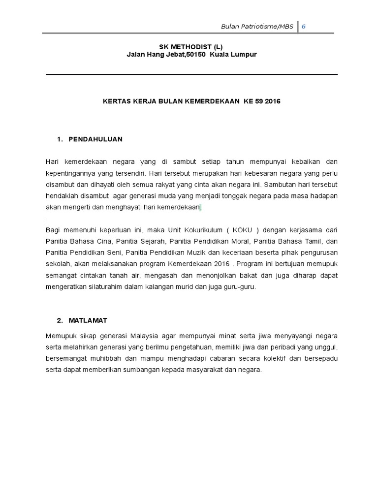Kebaikan sambutan hari kemerdekaan. Mereka juga amat mudah meniru dan memandang tinggi bangsa luar khususnya bangsa eropah. Tanggal 31 ogos setiap tahun sambutan bulan kemerdekaan akan diadakan sama ada. Sambutan hari kemerdekaan perlu diadakan untuk memupuk semangat patriotisme dalam kalangan rakyat malaysia hal ini kerana generasi muda hari ini mudah hanyut dan terikut ikut dengan budaya barat.