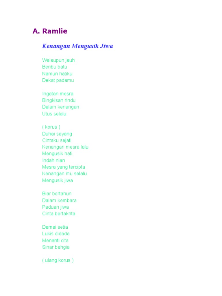 Jiwa kian terpisah makin sengsara. Dalam kenangan utus selalu duhai sayang cintaku sejati kenangan mesra lalu mengusik hati indah nian mesra yang tercipta kenangan mu selalu mengusik jiwa. Oh sesalan sesalan datang meragut hati pedih.